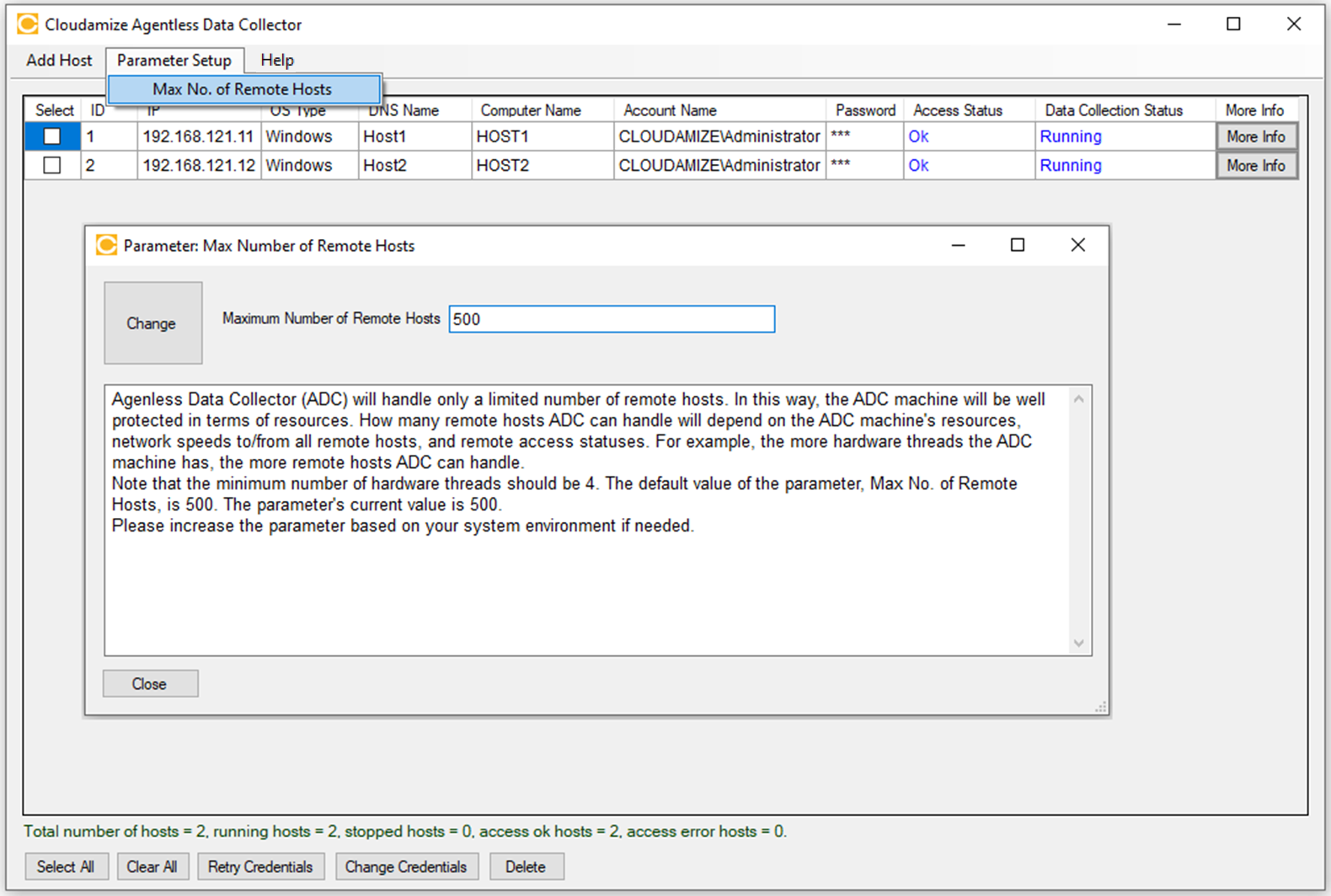 The default limit of adding hosts per Agentless Data collector is 500 to protect ADC well in terms of resources, and if you try to add hosts more than the limit (e.g., 500 hosts), the following error message will appear.
