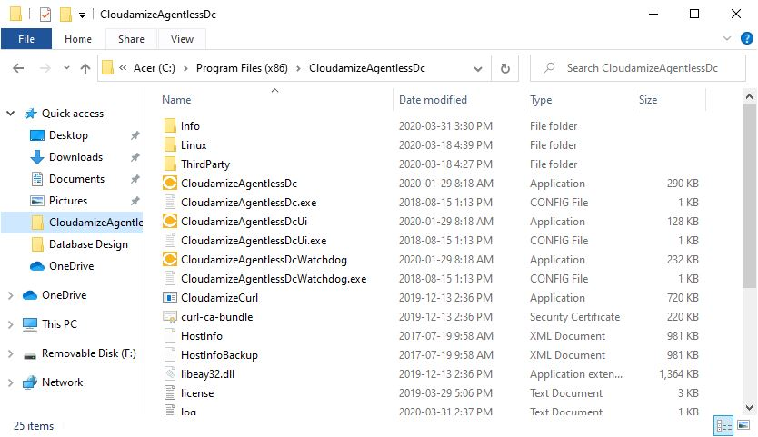 In the event that hosts were added to the agentless data collector, the HostInfo.xml and HostInfoBackup.xml files should be backed up in a separate folder, such as C:\Temp, before uninstalling the Cloudamize agentless data collector. These files are located in: C:\Program Files\CloudamizeAgentlessDC or C: Program File (x86)\CloudamizeAgentlessDC depending on your architecture. Please note that these files can only be accessed by accounts that belong to the Administrators group.