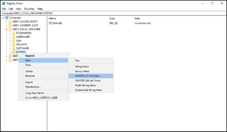Open Regedit, right-click on the System folder, and select “New” and “DWORD (32-bit)”