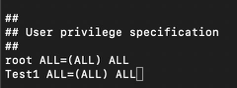 Navigate to root ALL=(ALL) ALL underneath the header User Privilege. Move the cursor to the end of the line and enter the letter “o”, this will create a new line. Enter the following text: