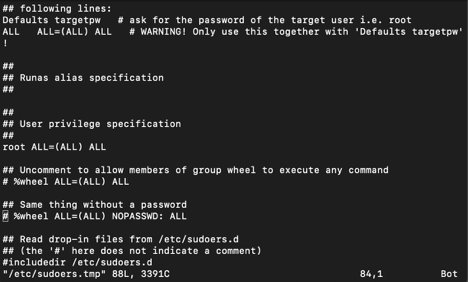 Note: If there is a # symbol in front of %wheel ALL=(ALL) ALL then it must be removed before editing the configuration. Remove the #, press the Esc key, type “:wq!” and press Enter