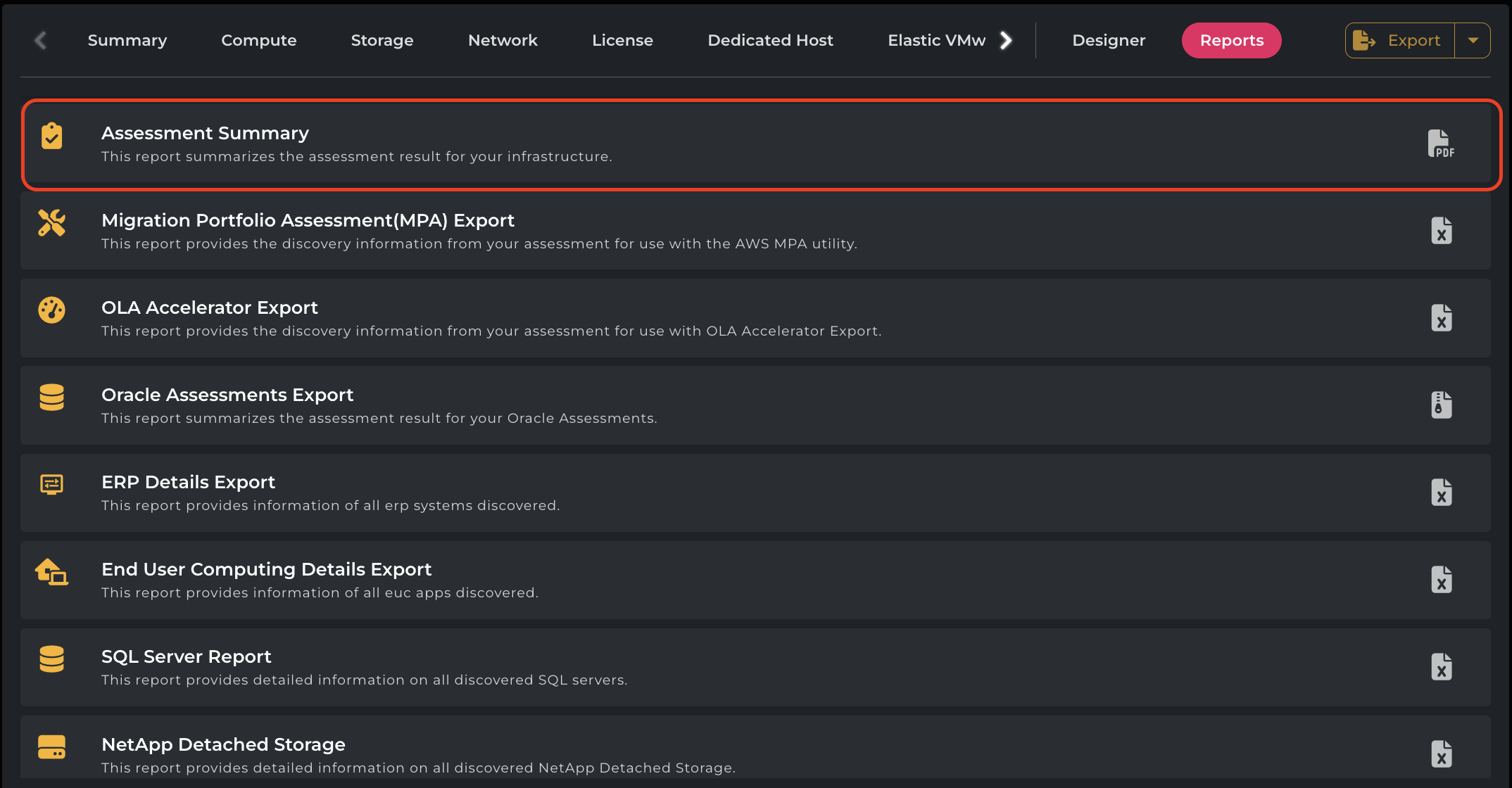 The Assessment Summary Report is a downloadable PDF report available in the Assessment Reports section. This report provides an executive overview of the cloud migration assessment. It condenses key findings, TCO projections, workload sizing, and optimization opportunities, offering strategic insights for cloud adoption.