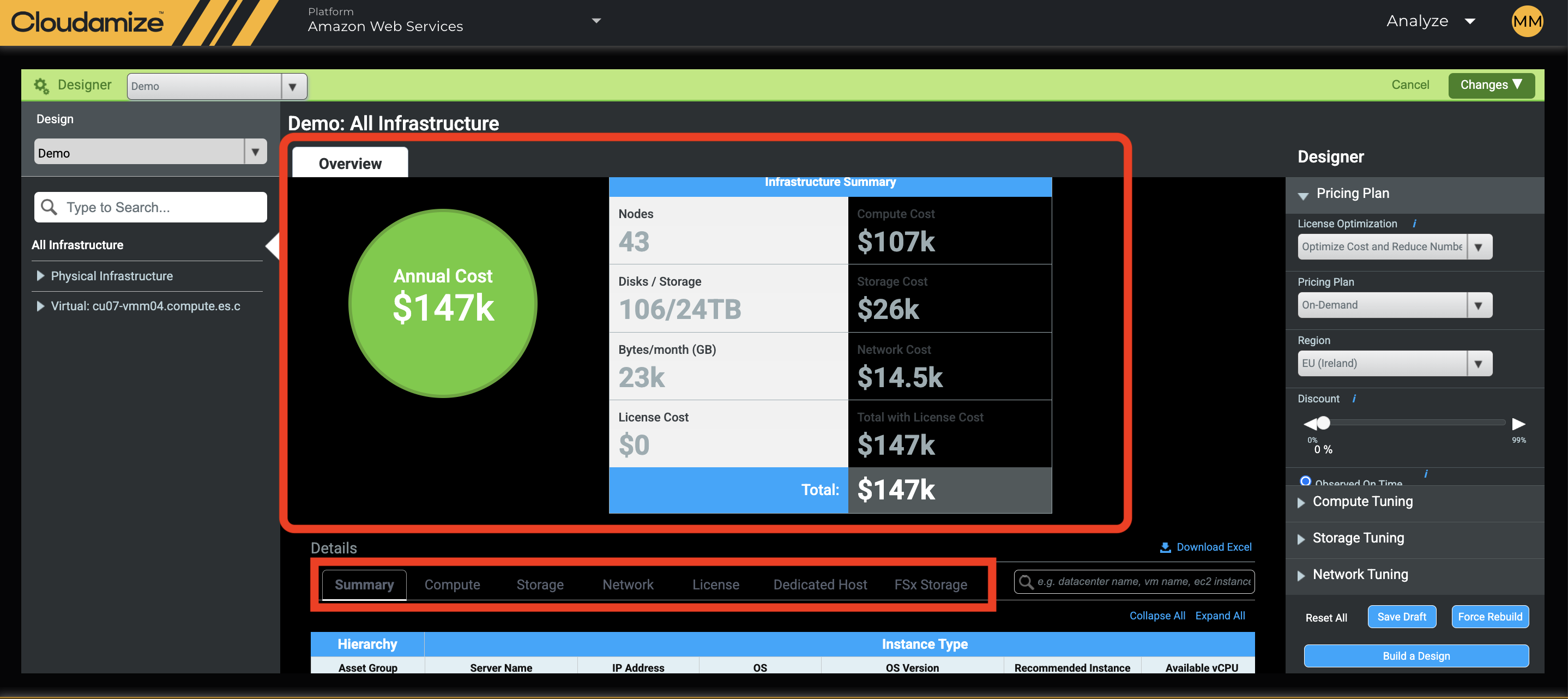 In the middle is the Annual Cost, along with the Infrastructure Summary. Underneath is the details chart for Summary, Compute, Storage, Network, and License.