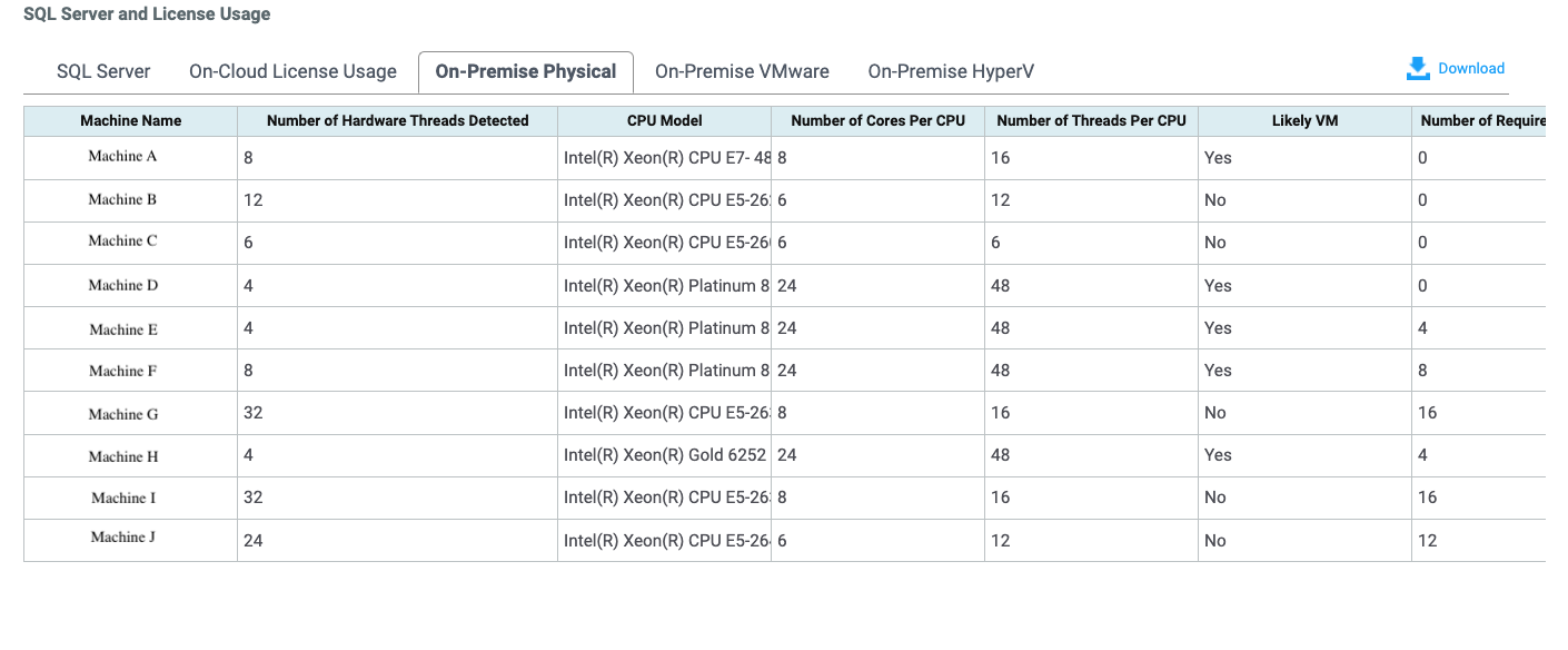 The information provided within the SQL Server and License Usage machine allows you to gain further insight into the on-premise licensing data and view a comparison of host-based versus VM-based SQL licensing. This feature also provides an overview of necessary on-cloud SQL licensing.