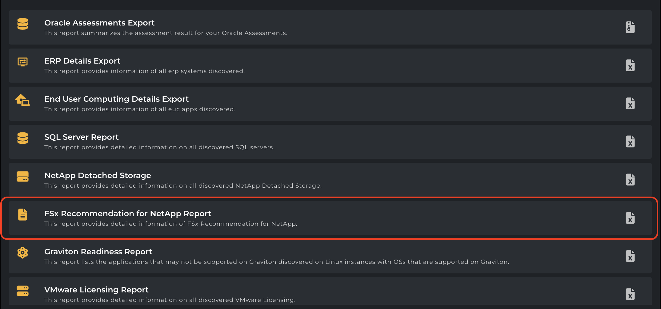 The FSx Recommendation for NetApp Report is a downloadable Excel report available in the Assessment Reports section. This report provides recommendations for optimizing Amazon FSx for NetApp ONTAP implementations. It's built on data collected via the Agentless Data Collector (ADC) from your NetApp ONTAP systems (v9.6+), ensuring performance and cost efficiency.