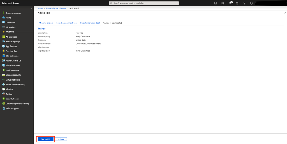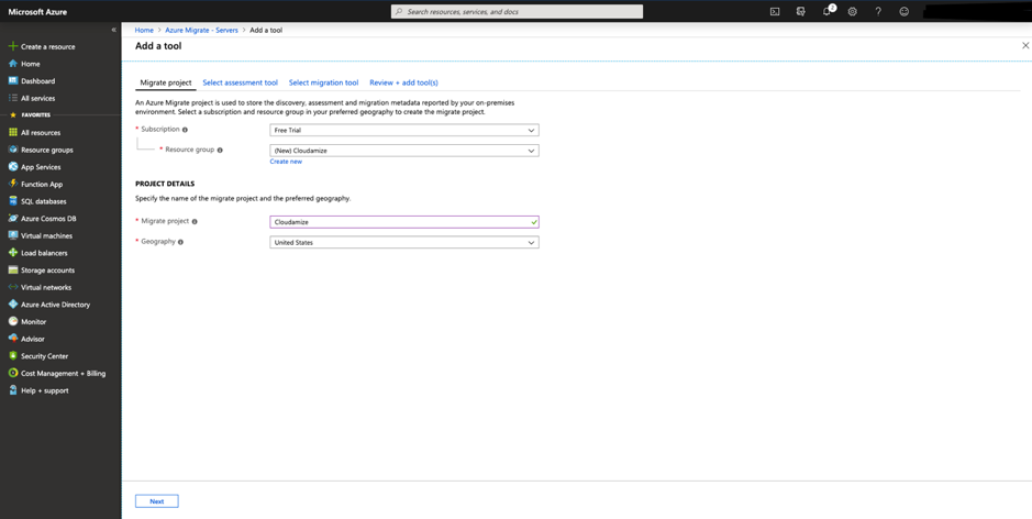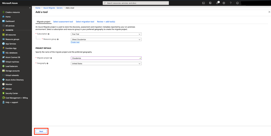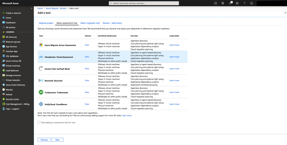 In the Select assessment tool tab Select Cloudamize: Cloud Assessment as the tool. Click on Next.
