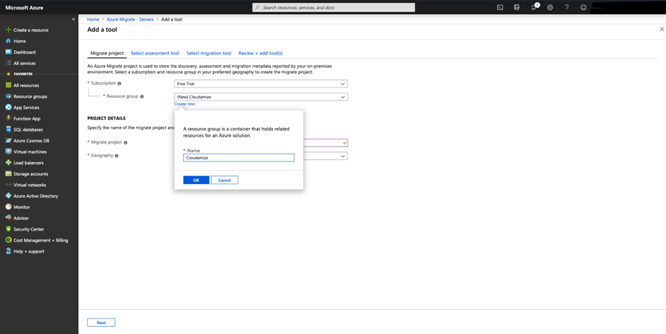 Select the Microsoft subscription from the Subscription drop down and select an existing resource group from Resource group drop down. If there are no existing resource groups, create a new resource group by clicking Create new. Select the Project for migration and the appropriate Geography.