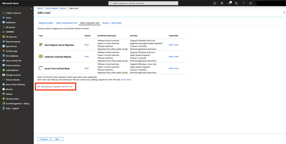In the Select migration solution tab, leave the checkbox Skip adding a migration solution for now checked and click on Next.