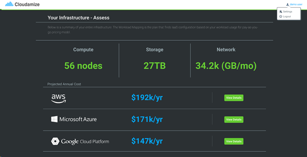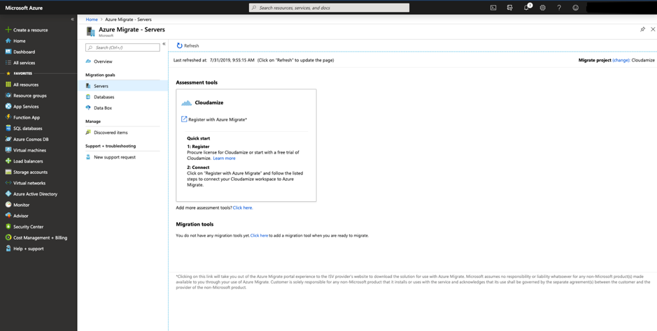 The Servers tab will display the Cloudamize Assessment tool. If it is not populating, refresh the page as the Assessment tool creation might take a few seconds.
