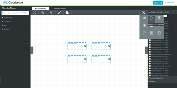 The Migration project can be changed at any time by clicking change. Machine data will be populated in this screen once uploaded from Cloudamize portal.