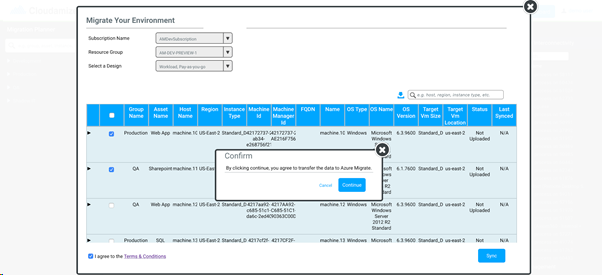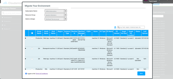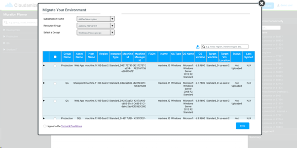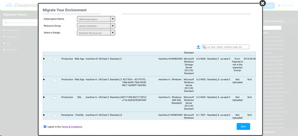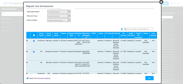 Once you finalize the design, Read and check the box to agree Terms and conditions. Select the machines and click on Sync to upload the data to Azure portal.