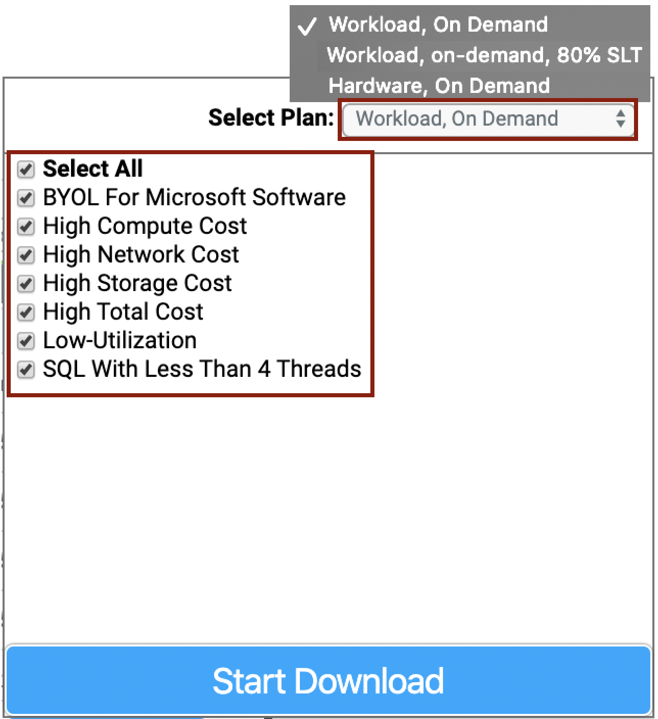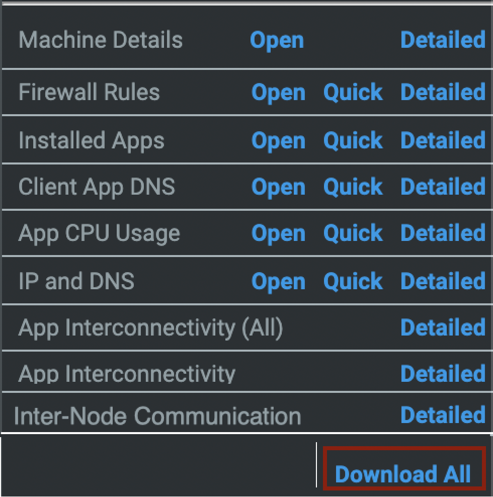 All reports are available for download, individually here, or you have the option to ‘Download All’ at the bottom of the report list. This will create an excel report detailing all of the information, except for the Application Interconnectivity due to the size of the interconnectivity report, it must be downloaded separately. This report also includes the Compute, Storage, and Network from the assess dashboard.