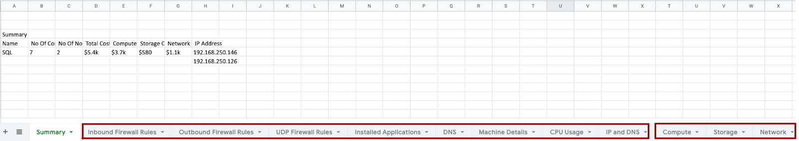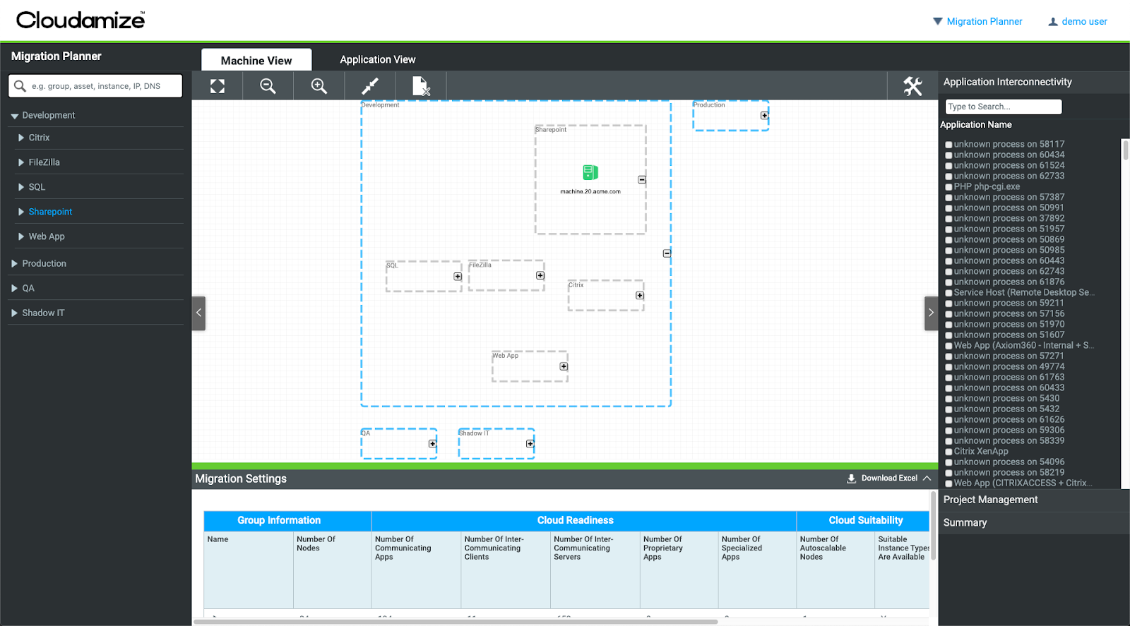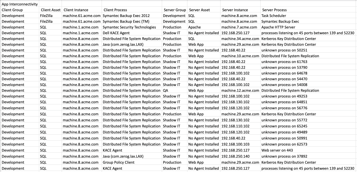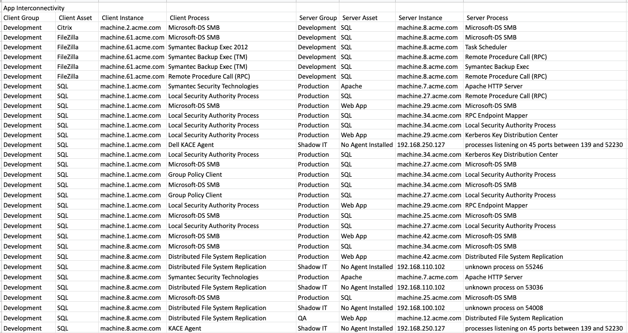 ![]() App CPU UsageBy ‘clicking’ on App CPU Usage, it will open a new window and present you with a report and list the individual process name, along with the observed CPU usage of that application. ![]() ![]() IP and DNSBy ‘clicking’ on IP and DNS, it will open a new window and present you with a report and list the IP Address and DNS Name for each observed machine. ![]() ![]() App Interconnectivity (All)By ‘clicking’ on App Interconnectivity (All), it will open a new window and present you with an excel report, which will show all communication observed by Cloudamize. ![]() ![]() App InterconnectivityBy ‘clicking’ on App Interconnectivity, it will open a new window and present you with an excel report, which will detail only communication between applications being considered for migration. You can control what is being considered for migration by using the application inventory settings. ![]() ![]() Inter-Node CommunicationBy ‘clicking’ on Inter-Node Communication, it will open a new window and present you with an excel report, which will show all the connections of a selected Group, Asset, or Node. This will allow you to view all the dependencies, and help prioritize applications for migration. For example, if there are too many outbound server connections, you are able to review and decide if that should be part of your ‘Phase One’ migration.