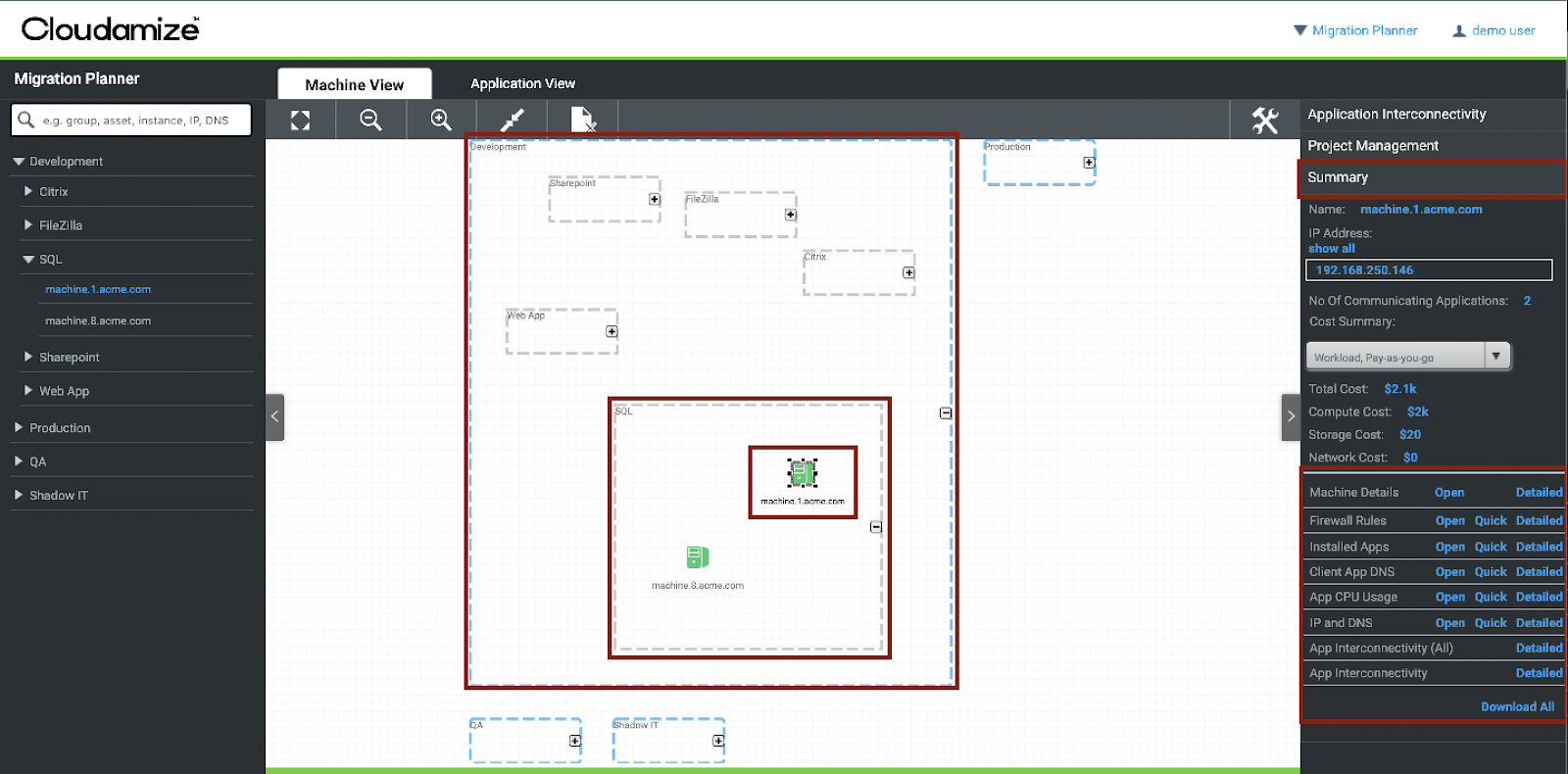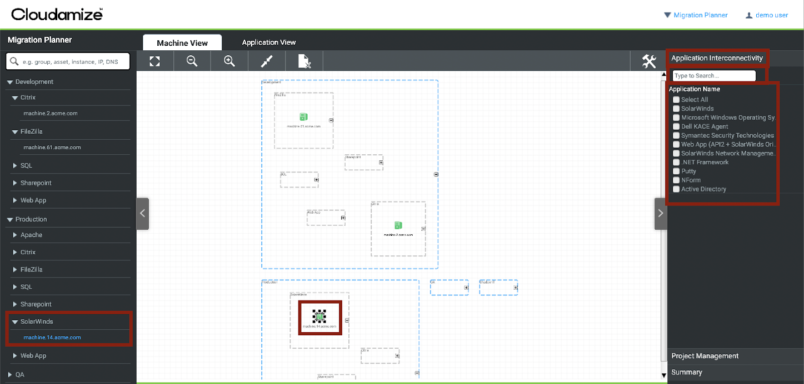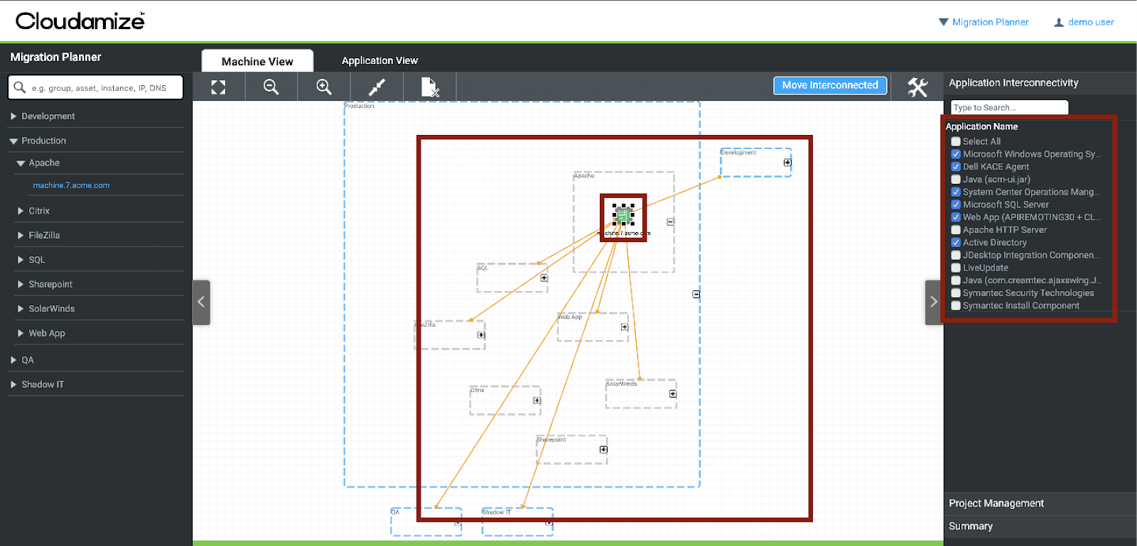 The Migration Planner will assist you in creating and executing a migration plan by visualizing all available machine- and application-level data.