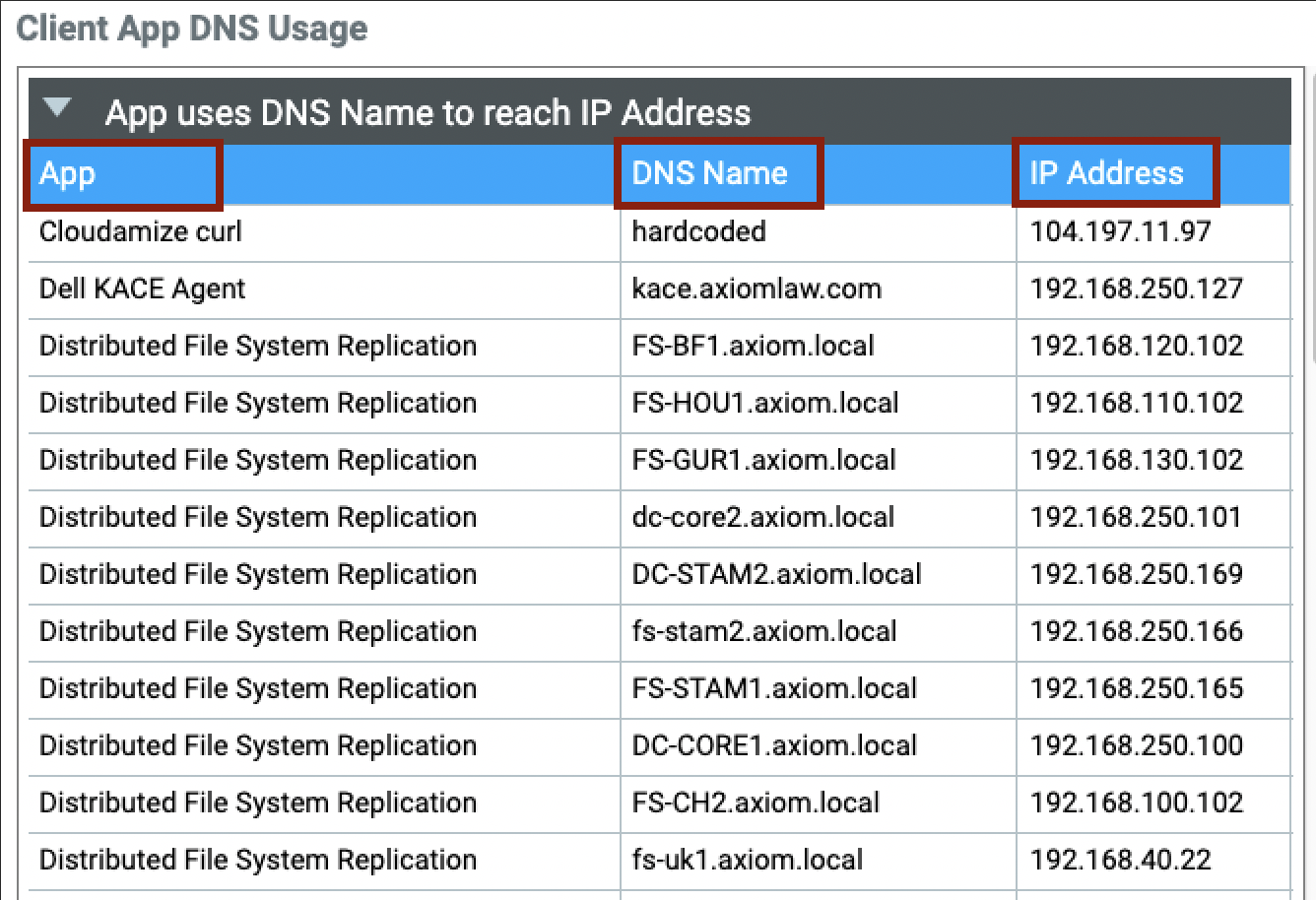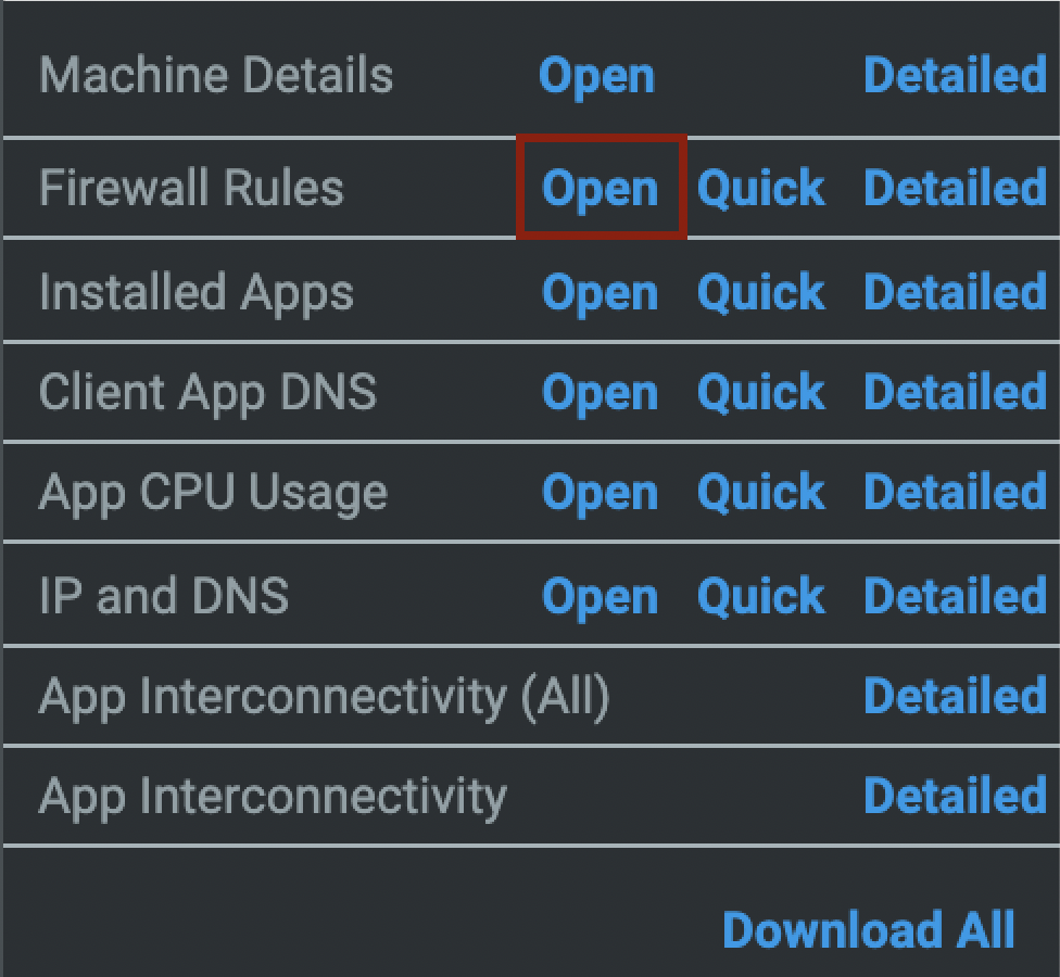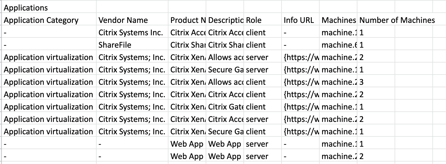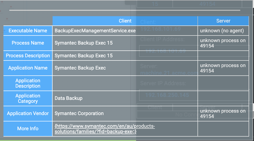 This report presents the name of the applications, their versions, and the application vendor. Please Note, that this is only available for projects with less than 400 nodes ![]() Client App DNSBy ‘clicking’ on Client App DNS, it will open a new window and present you with a report and provide you with the name of the application, along with the DNS name that application uses to reach the specified IP Address. ![]()