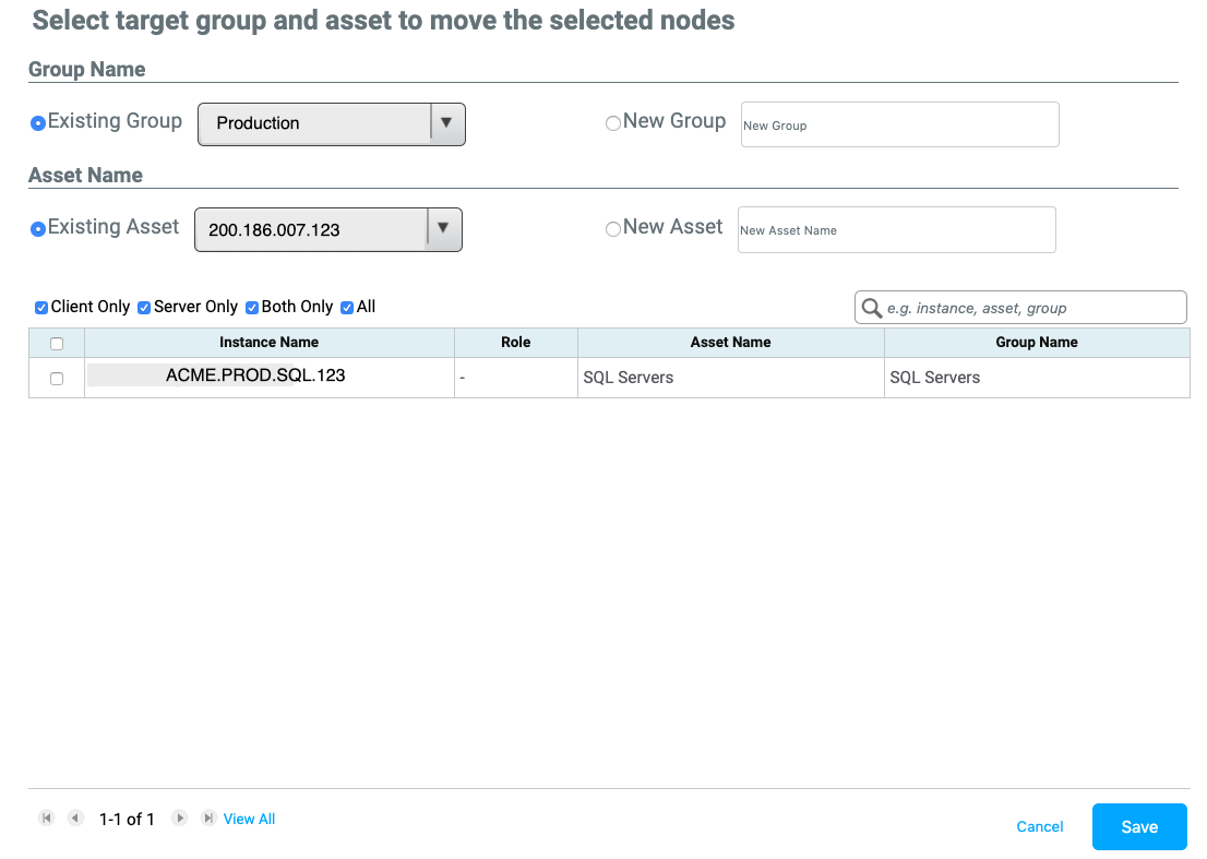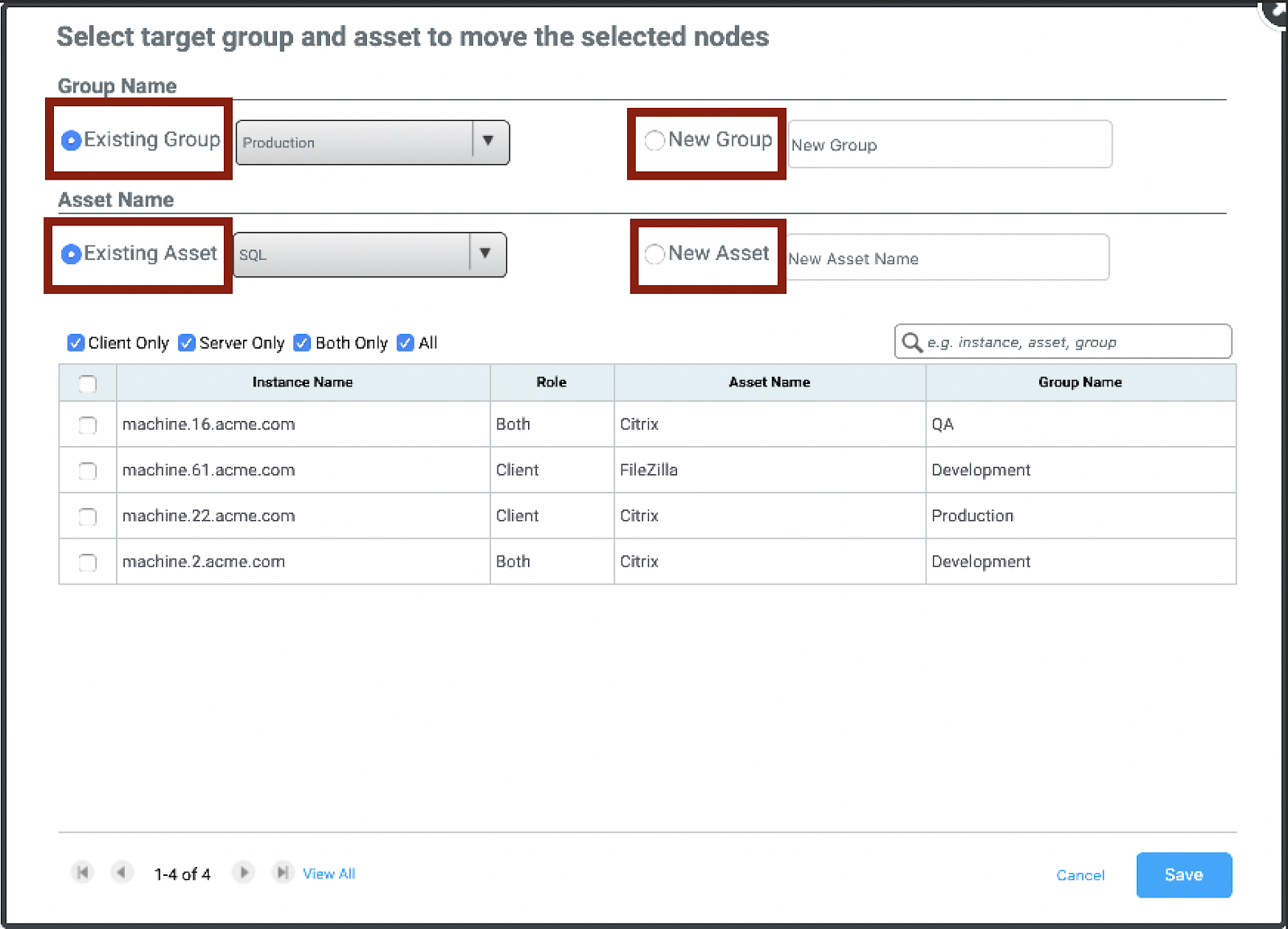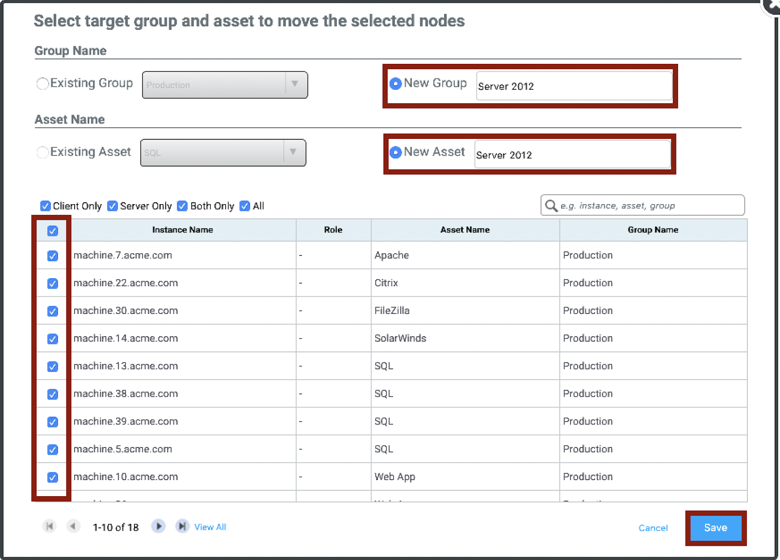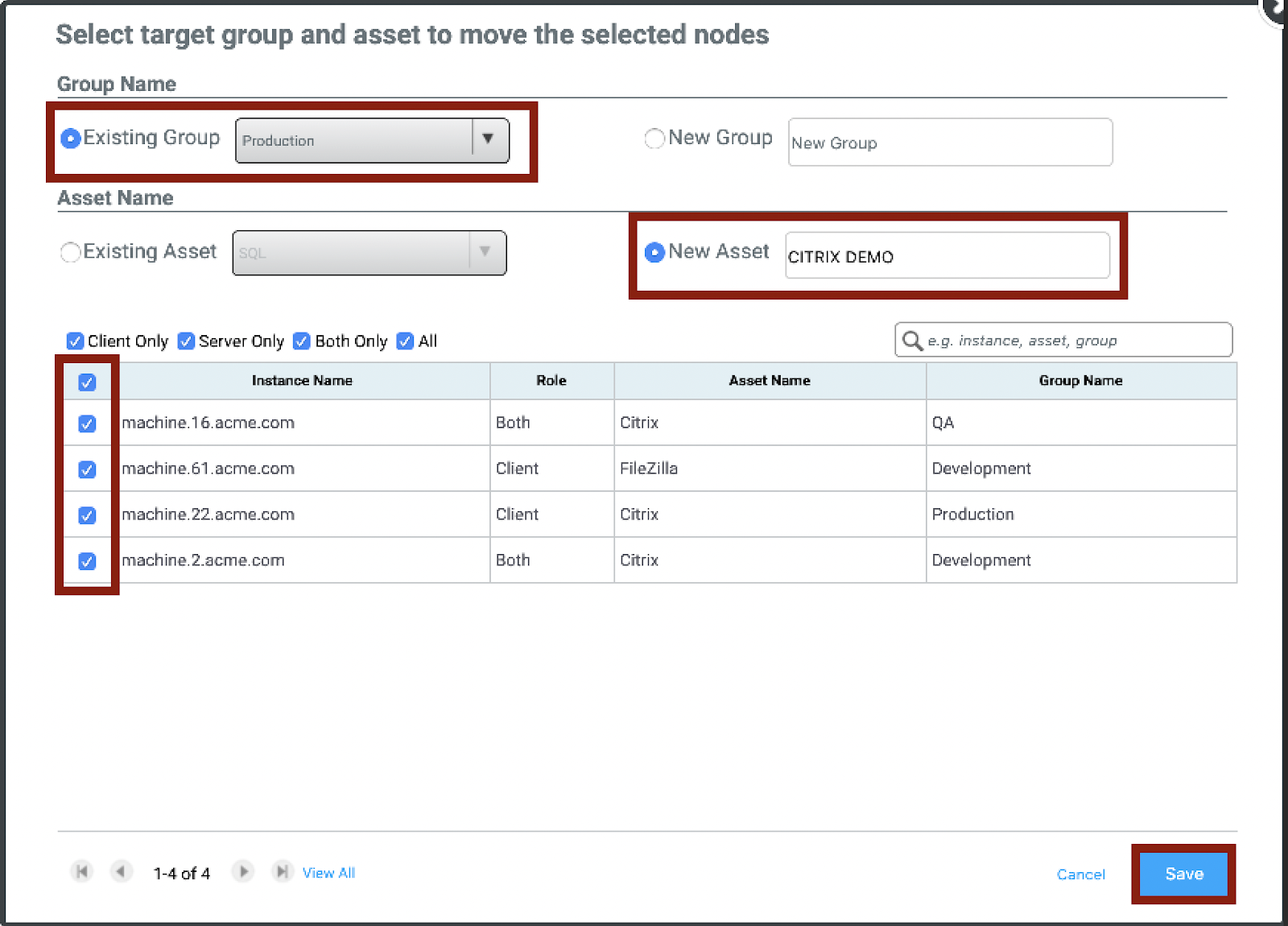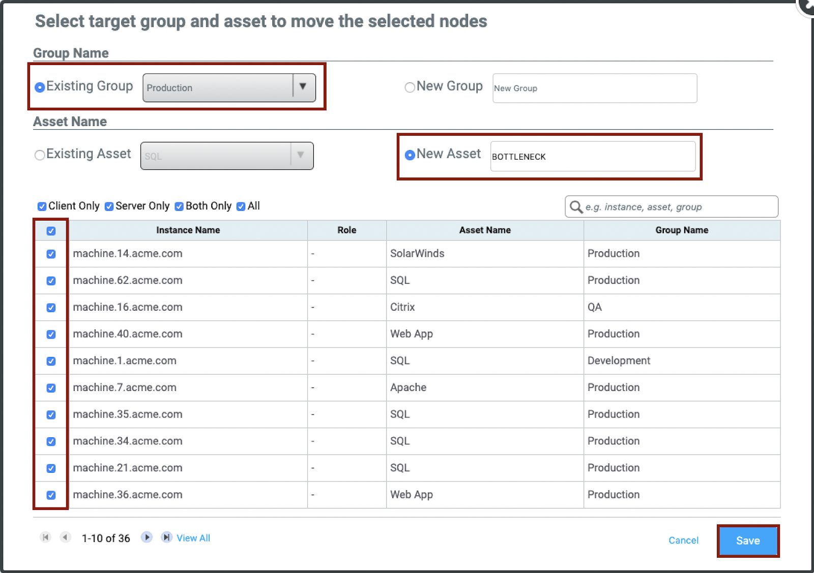 Here we will create a New Asset. First, select the Existing Group, you want you asset to be located in, and then name your New Asset. You have the ability to add individual machines to add to this asset, or select all. When finished click Save. After clicking save, you will be returned to the canvas, and your New Asset will be created. Follow the same process to continue making other Application-Based Move Groups