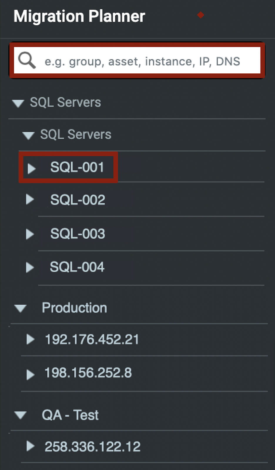 The panel on the left-hand side of the page will allow you to view those same groups and assets, as well as drill down to specific machines. Above the group lists is a search bar that will allow you to search based on a number of criteria, such as, group, asset, or machine name, along with DNS, IP Address or Operating System name. | ![]() |