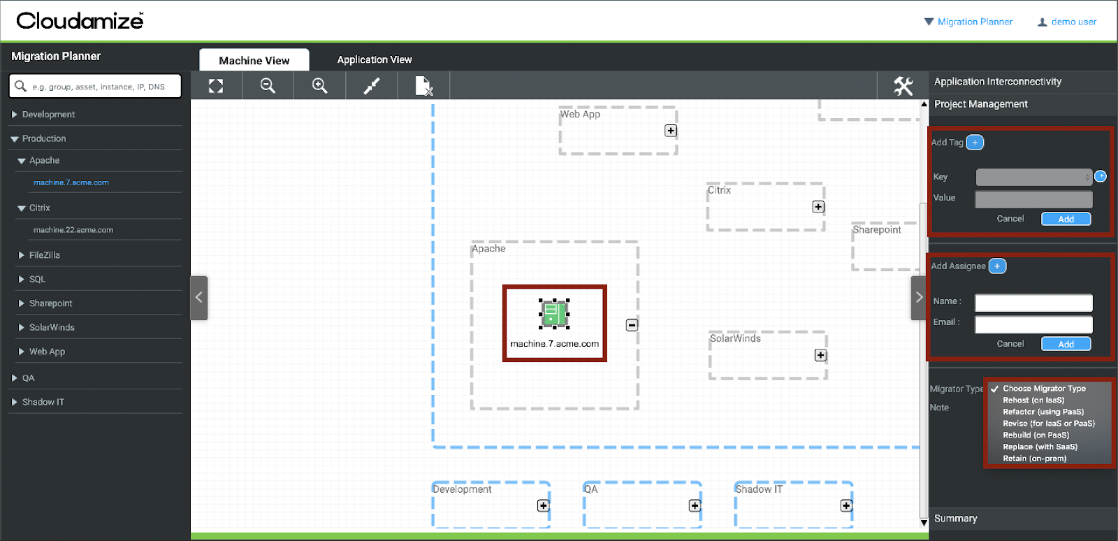 The Project Management [tab] allows you to assign tags, owners, migration type, and any other notes. You can later search based on these tags and build migration groups. You can use these tags to identify machines and create groups or assets. Tags can also be imported via CSV. For large environments, Cloudamize recommends using this functionality. | |
