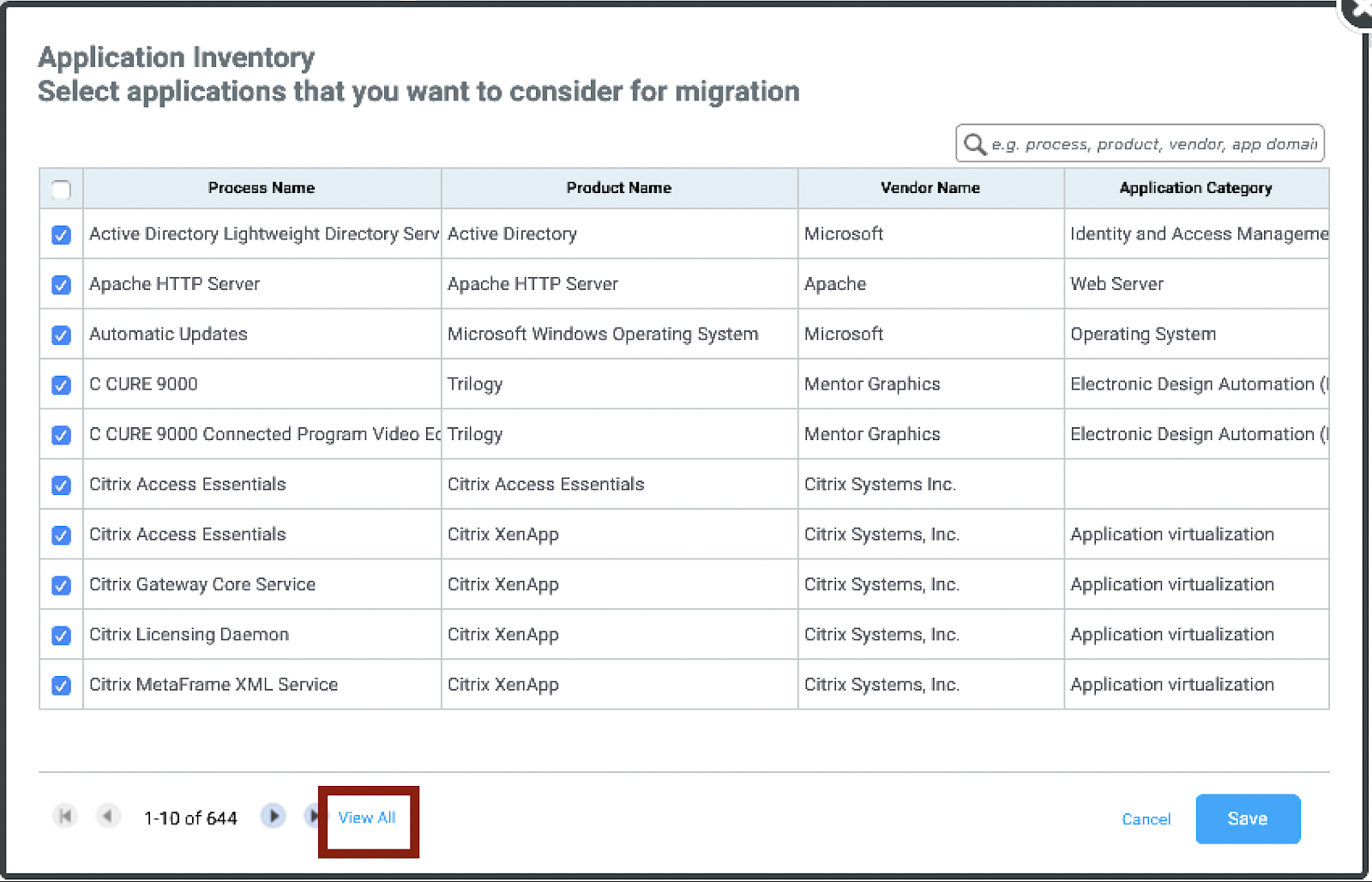 A new window will open allowing you to view all processes in the environment, and choose which should be considered for migration. First click View All at the bottom of the page to ensure you can see the entire list of observed processes |
