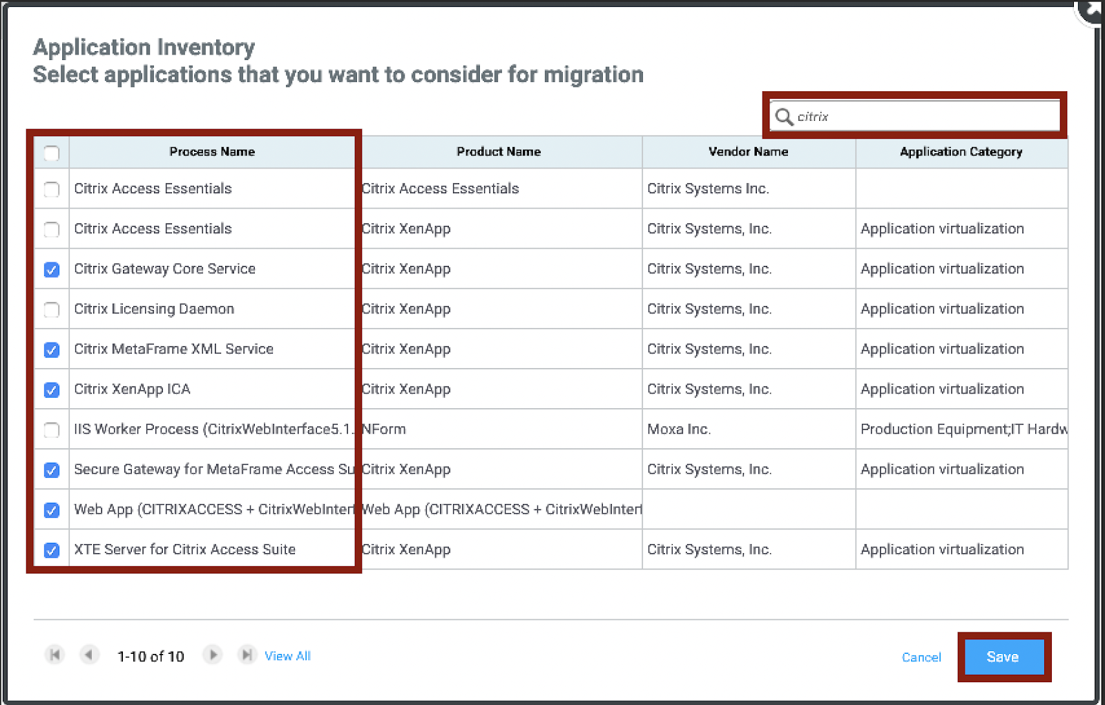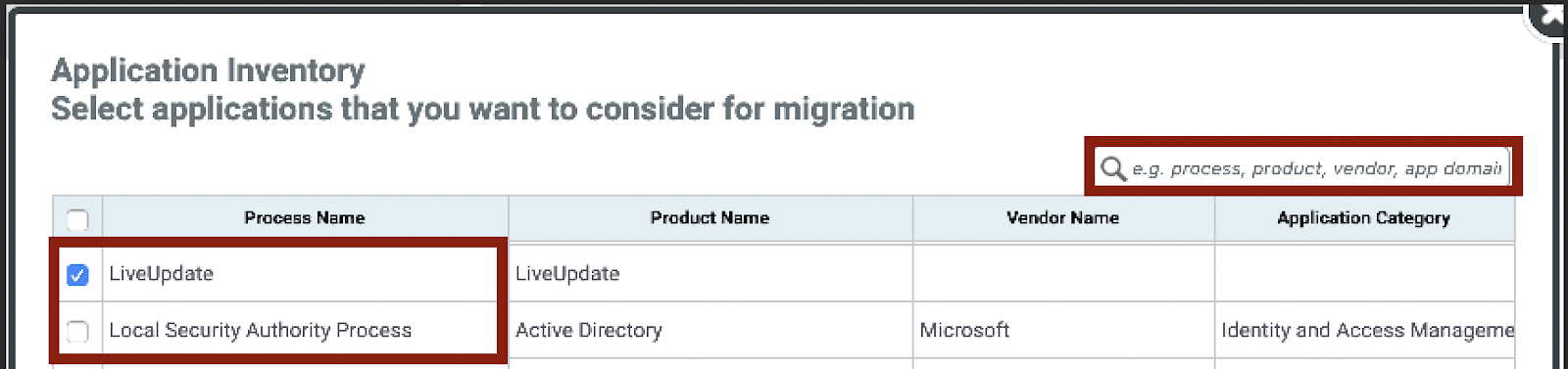 The first column, Considered (Check Box), will allow you to select which applications should or should not be considered for migration, by default Cloudamize will remove certain processes from consideration based on best practices.