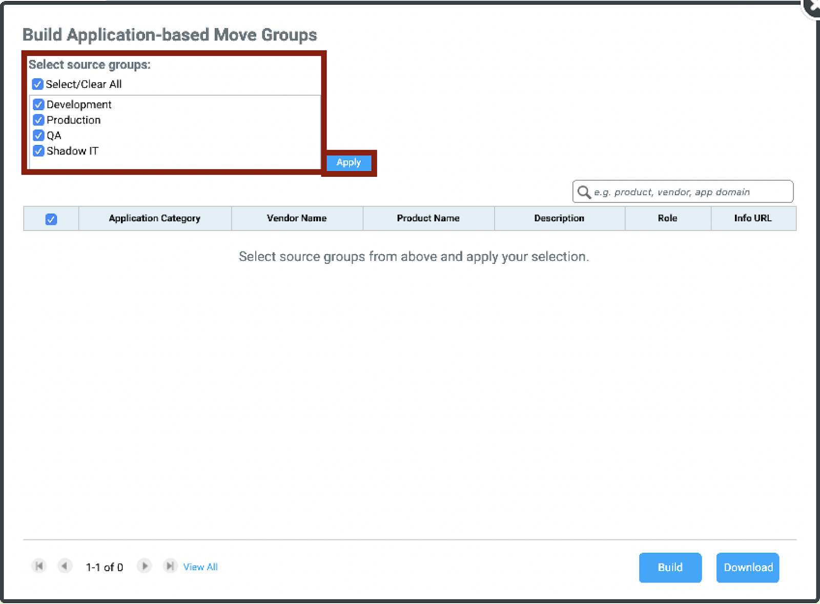 A new window will open where you can select the source, or source groups that you wish to filter from, and click Apply. By default all source groups are selected. |