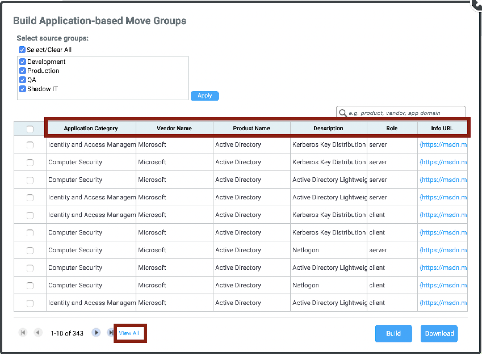 The Chart at the bottom of the screen will populate with any applications that fall within your selected source groups. From here you can sort the groups by Application Category, Vendor Details, Product Name, Description, Role, or Info URL. There is also an option to view all machines in one page by clicking the View All button at the bottom of the page |