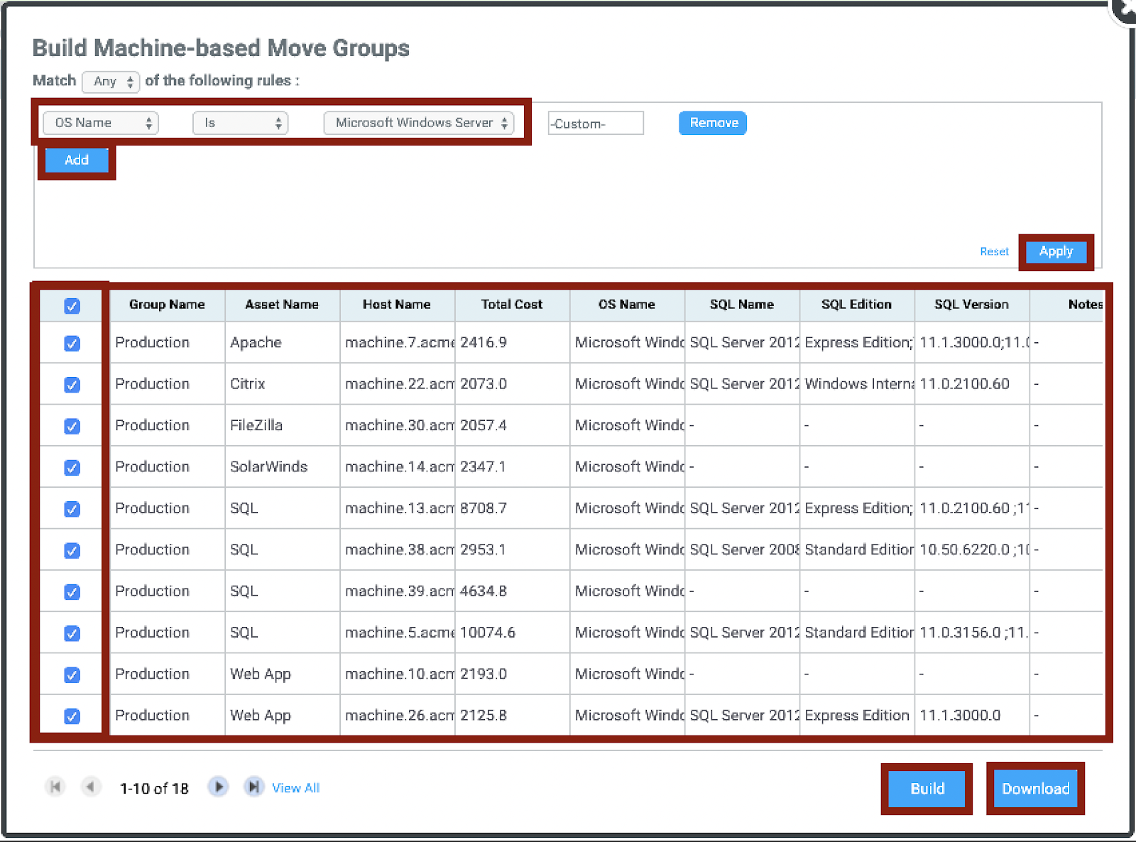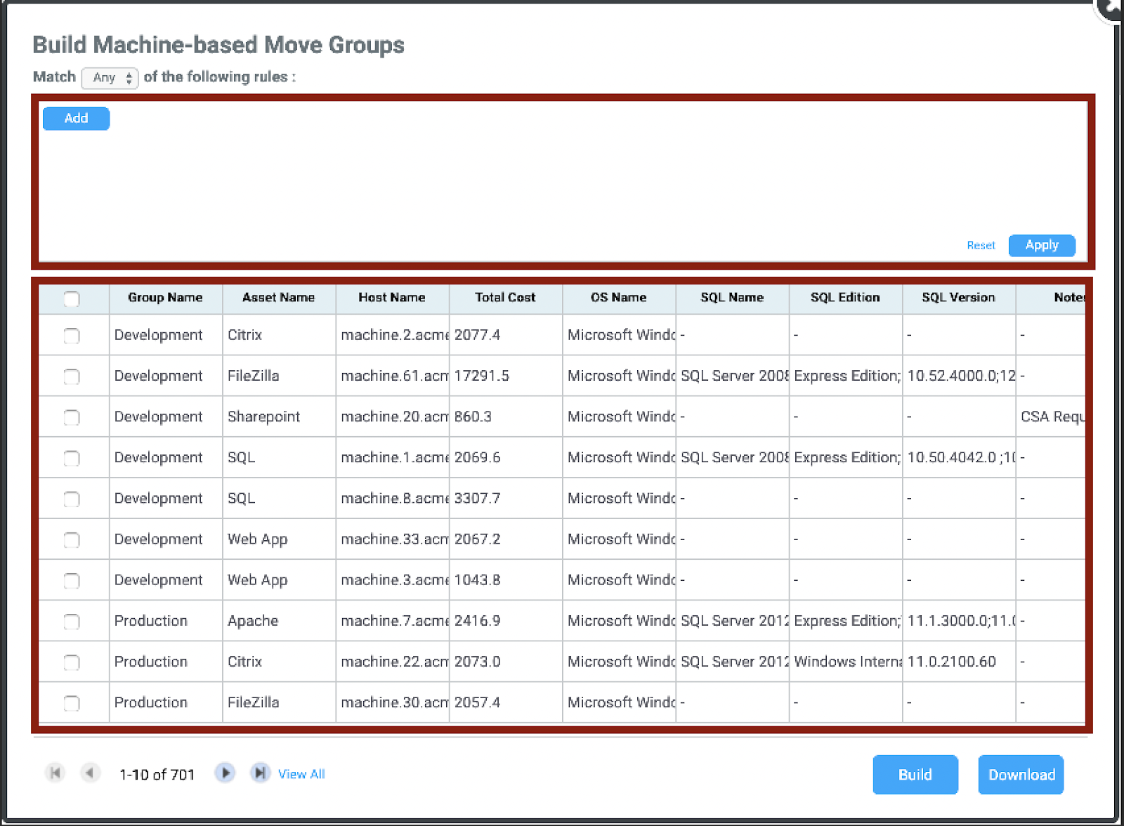 You can use the search bar to filter by specific application, the chart will filter based on your input, and show only those machines with the specified application.Select the machine, or machines you wish to add this group. At the bottom of the screen you have two choices, clicking Download will create a CSV file with the information included in your new move group Clicking Build will continue the group creation process.A new screen will open, allowing you to select an Existing Group, a New Group, an Existing Asset, or a New Asset | |