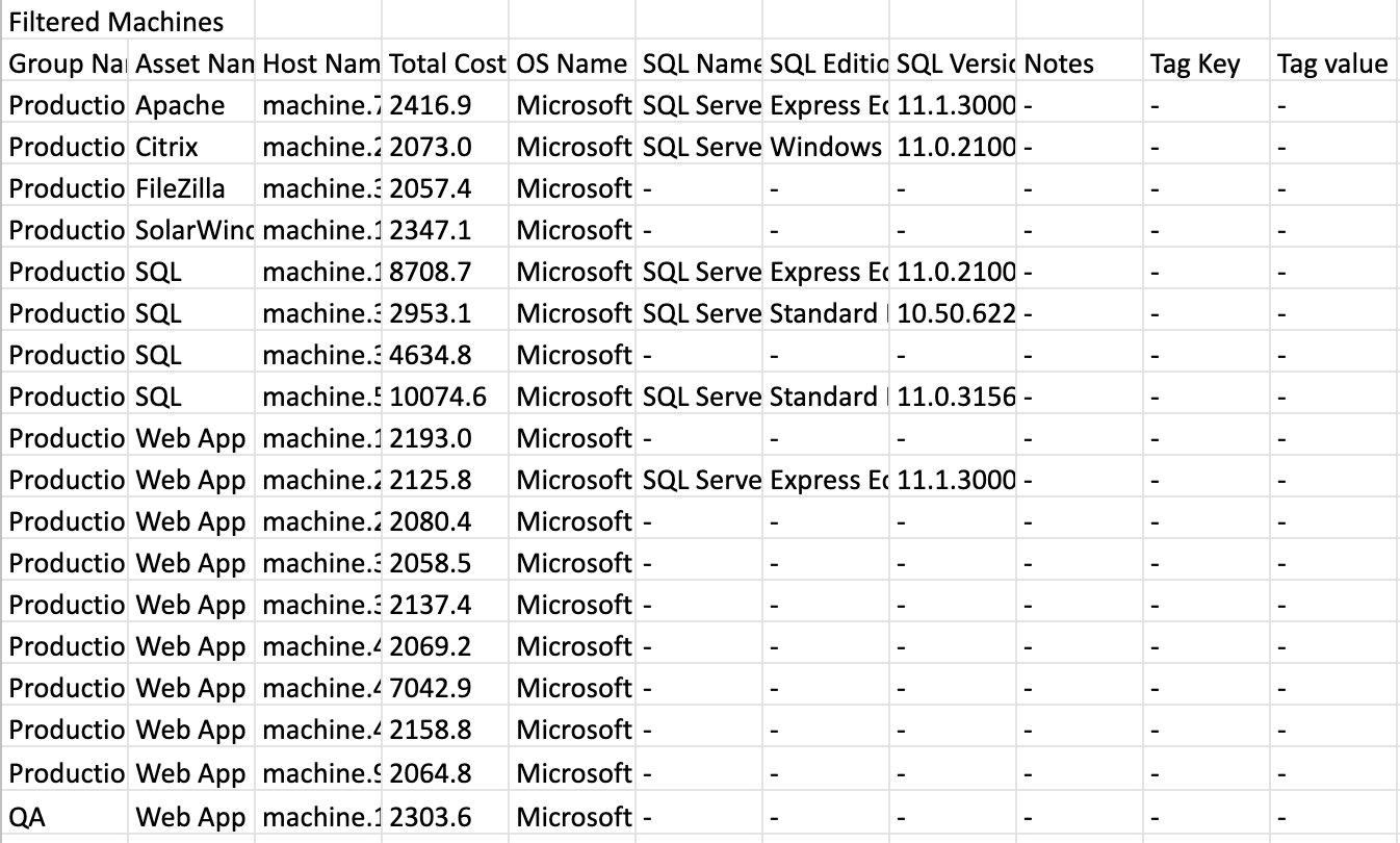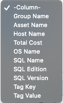 Filters include, Group Name, Asset Name, Host Name, Total Cost, OS Name, SQL Name, SQL Edition, SQL Version, Tag Key, and Tag Value. Please note that Tag Keys & Values are added through the Project Management [tab] discussed in the Migration Planner overview. | |
