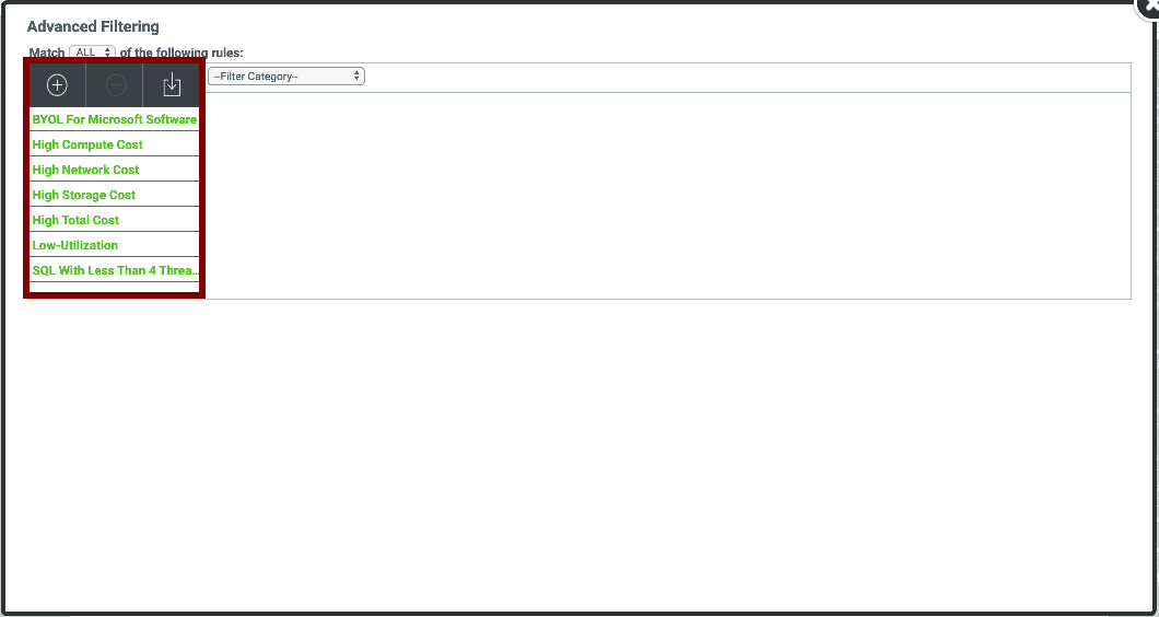 In the window that opens, on the left-hand side are some stock filters that Cloudamize provide for you, such as, high-compute, high-storage, or high-network cost amongst others. |