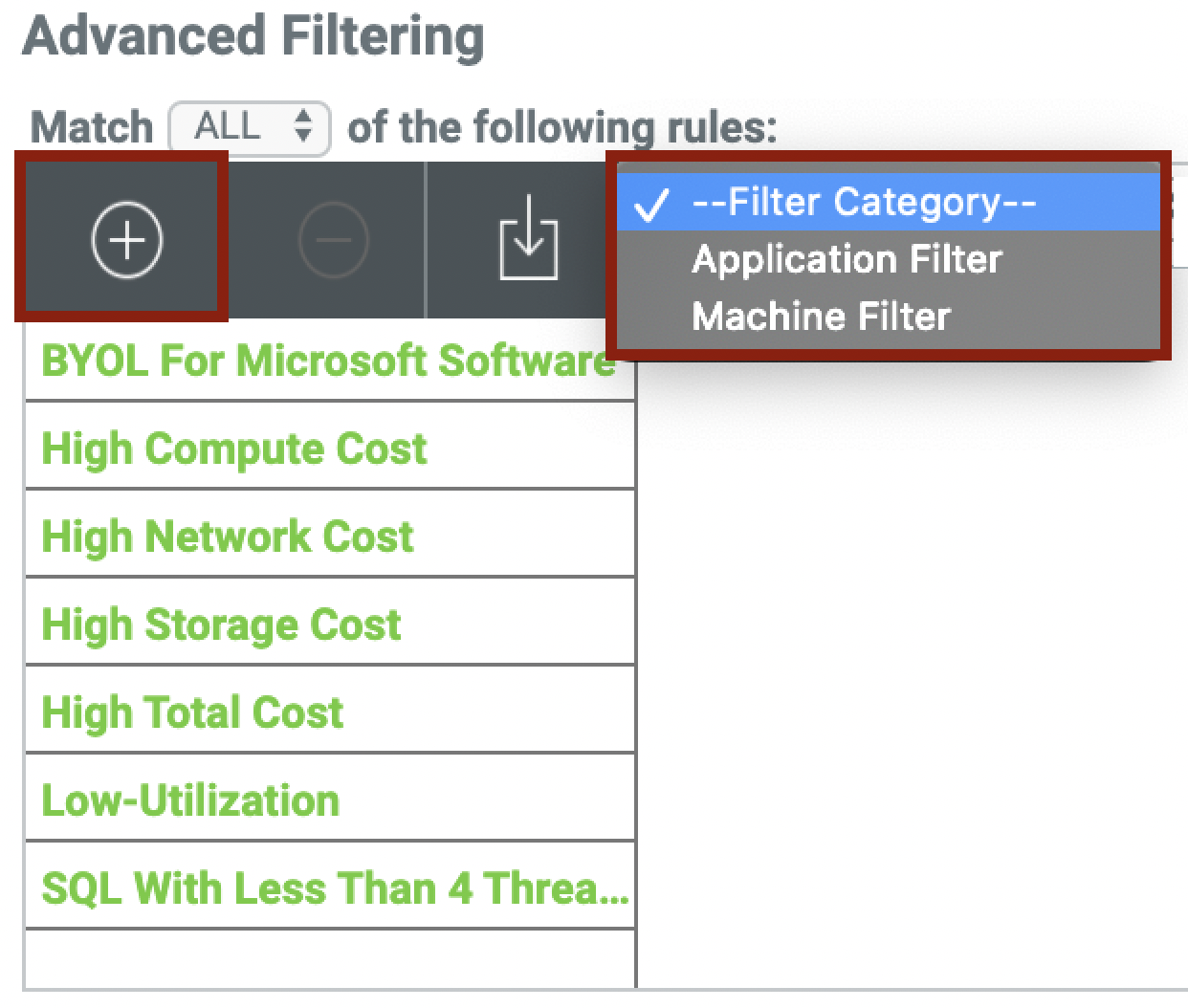 To create a new filter, click the ‘+’ button. After clicking the ‘+’ button, select either Application Filter or Machine Filter from the dropdown box to begin.