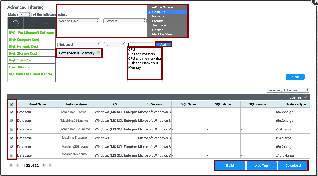 In the example below, we will create a Machine Filter. Click Add, and a new line will appear allowing you to filter by any field found within the selected category. In this example, we are creating a Compute Filter with a role looking for machines where the Bottleneck is Memory. After ‘clicking’ Add, the chart at the bottom will update to show only the machines, where the Bottleneck is memory.