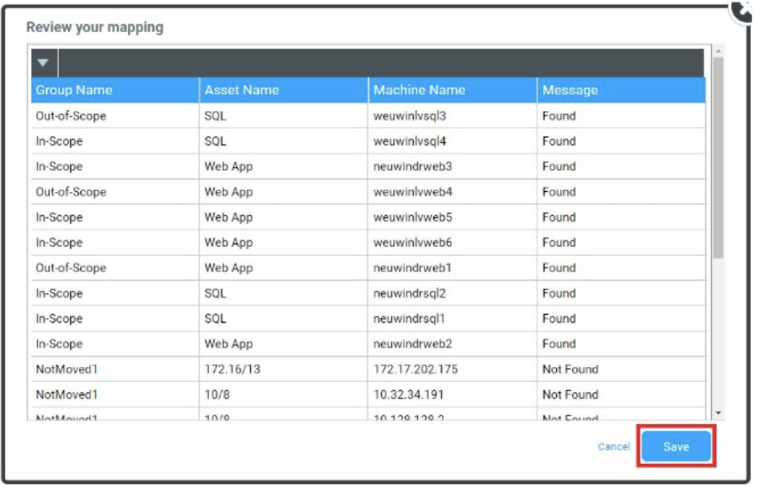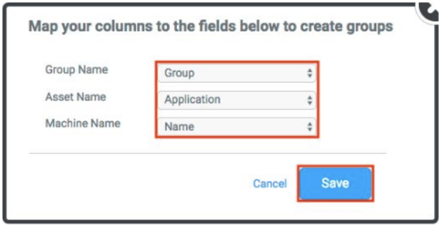 Create a CSV format which will be used to regroup your machines. The layout of this file can vary significantly based on your specific use-case, however, you will always need a column with the machine names and at least two other columns to map to Group name, and Asset name. These columns could be anything relevant to the environment - Production/Non-Production, Migration Type, Application, Scope etc...