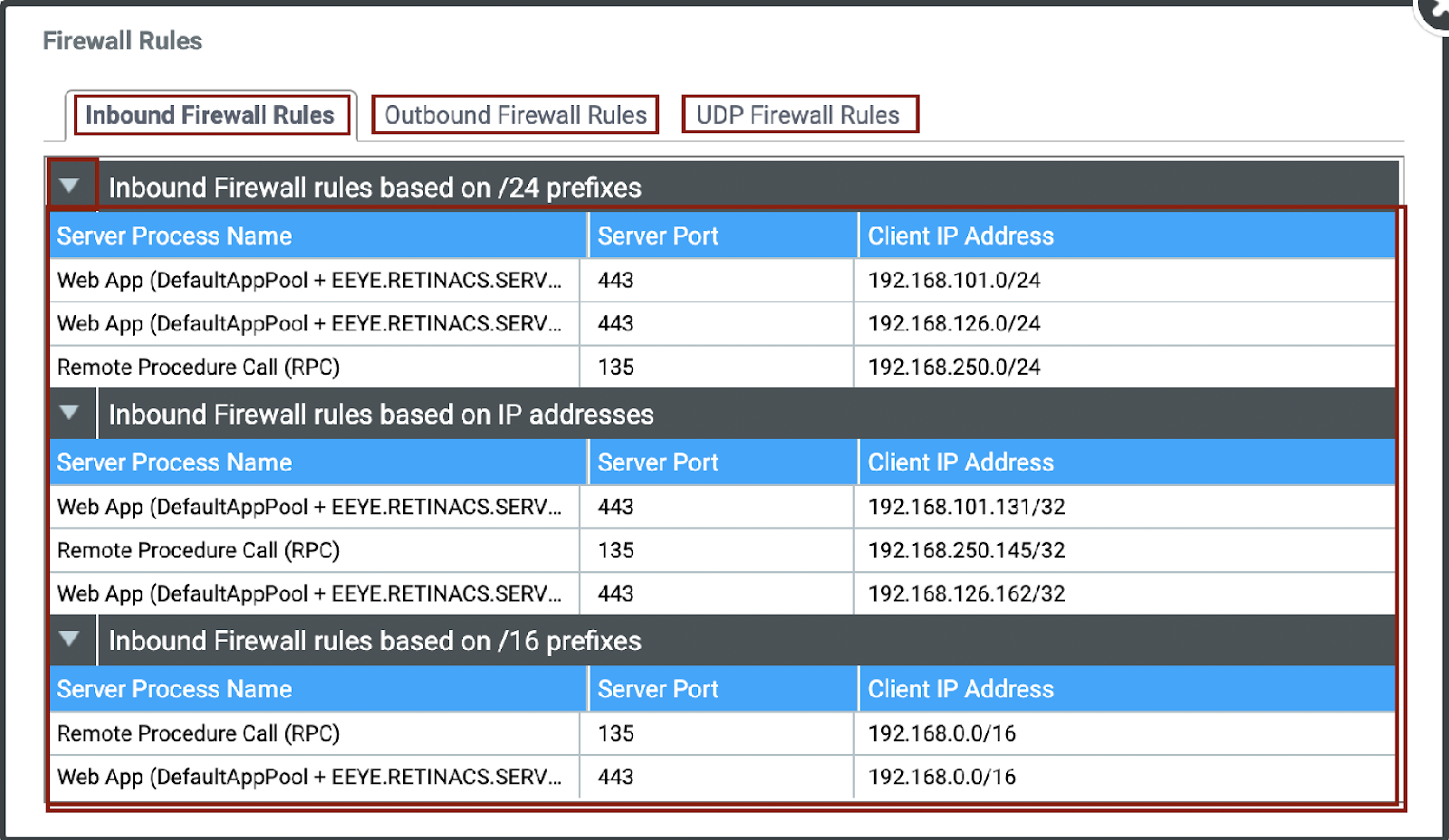 Under the Inbound [tab] you can view /16, /24, or /32 Firewall Rules