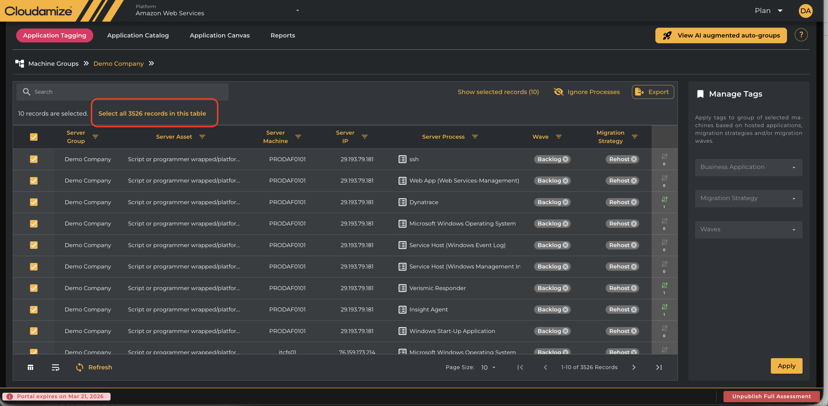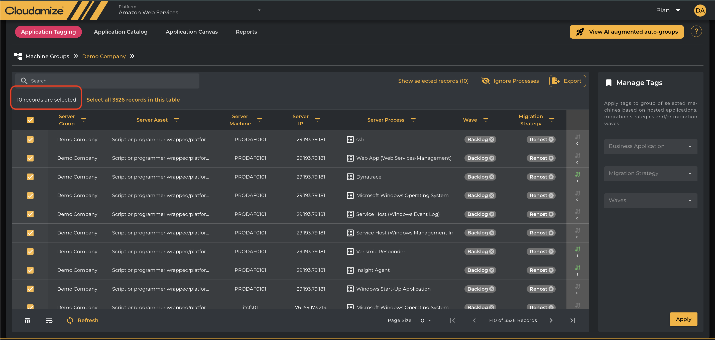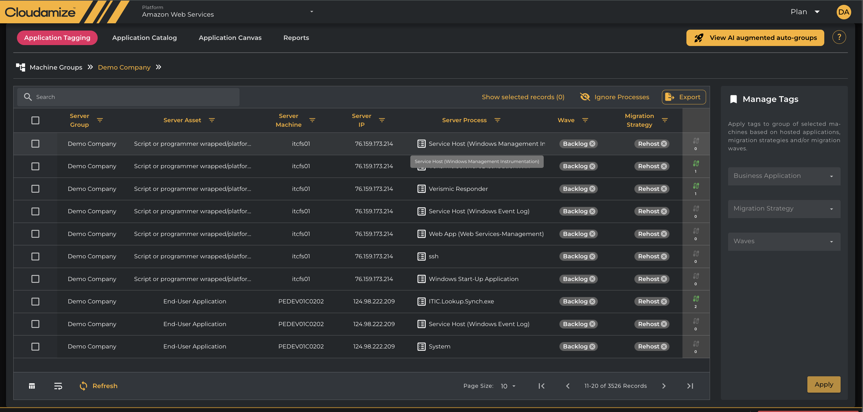 After applying tags, click the Apply button to save changes. The main view will refresh, displaying the applied tags on the selected rows. Please note that all the installed applications are tagged as Rehost and put into the Backlog Wave by default.