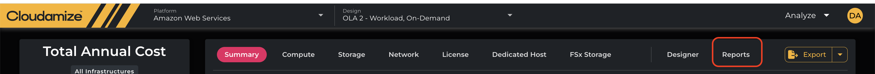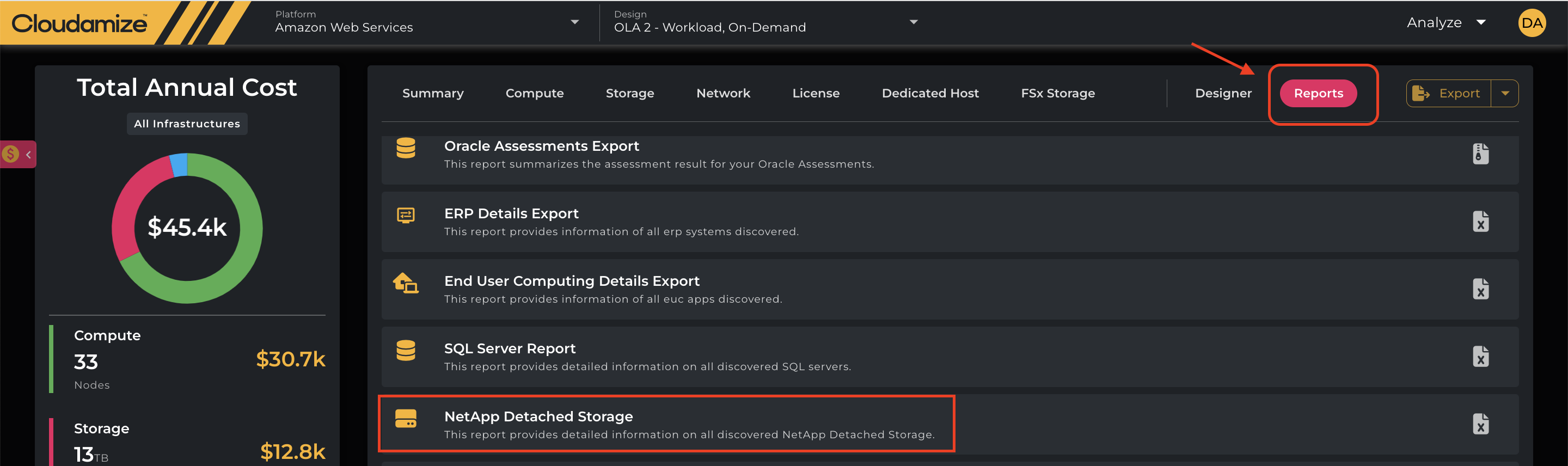 Cloudamize offers two reports relating to NetApp storage. They can be found in the Reports section (note that the FSx report is only available in AWS assessments)