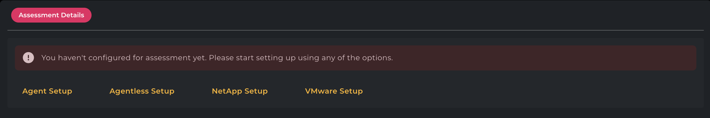 Once onboarding is complete and before adding your infrastructure to the assessment, the page displays the Setup Prompt: