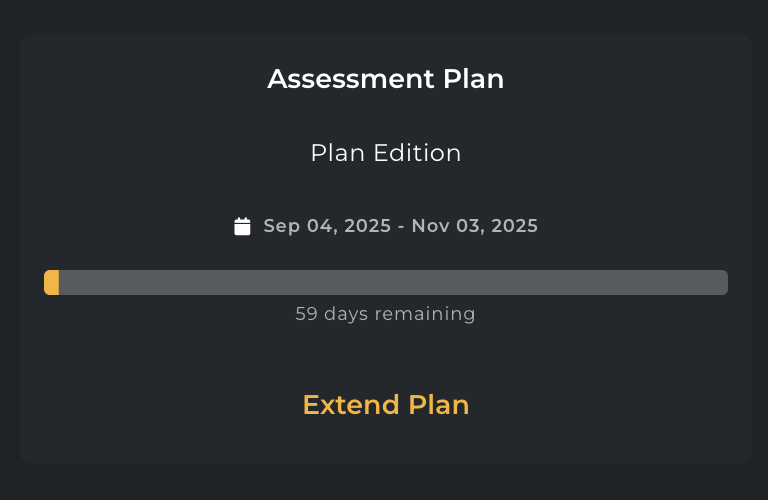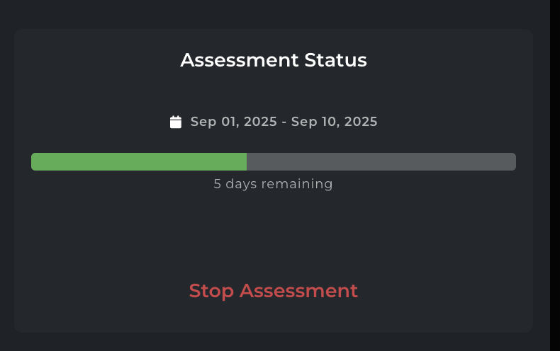 The start and end dates for your assessment license are shown here. These indicate when the assessment was first provisioned and when access will end. A progress bar visually represents this, along with the number of days remaining until assessment closure.