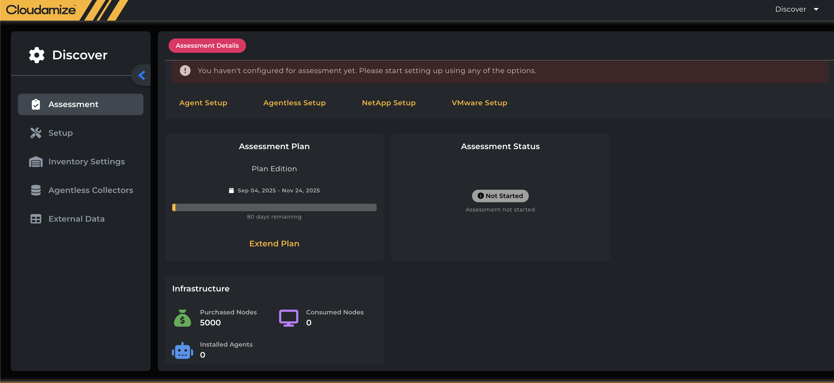 If you need to extend your assessment for any reason, the Extend Plan link directs you to the Cloudamize Helpdesk, where you can request an extension. Please note that the responsibility for final approval for extensions varies depending on the nature of your license. Cloudamize Helpdesk can advise in all cases