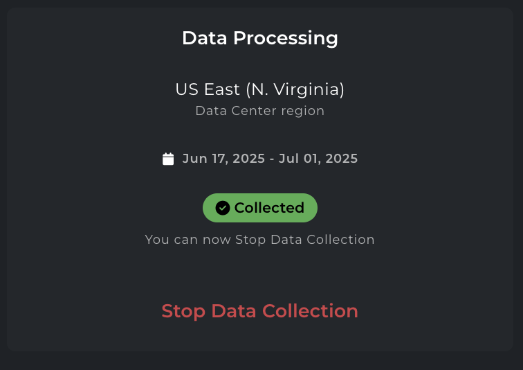 Data processing displays the start, end dates and Data Center region that specifies in which AWS region the data will be stored, along with a Stop Data Collection button. Clicking this button halts data collection, which then shows as disabled in the console inventory settings.