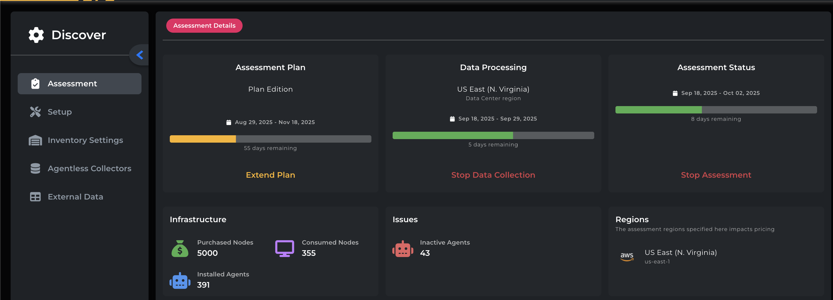 Once you have added all infrastructure via Agents, Agentless, etc., you can click the Start Assessment button to confirm infrastructure, choose regions, and set collection and delivery dates, beginning the assessment.