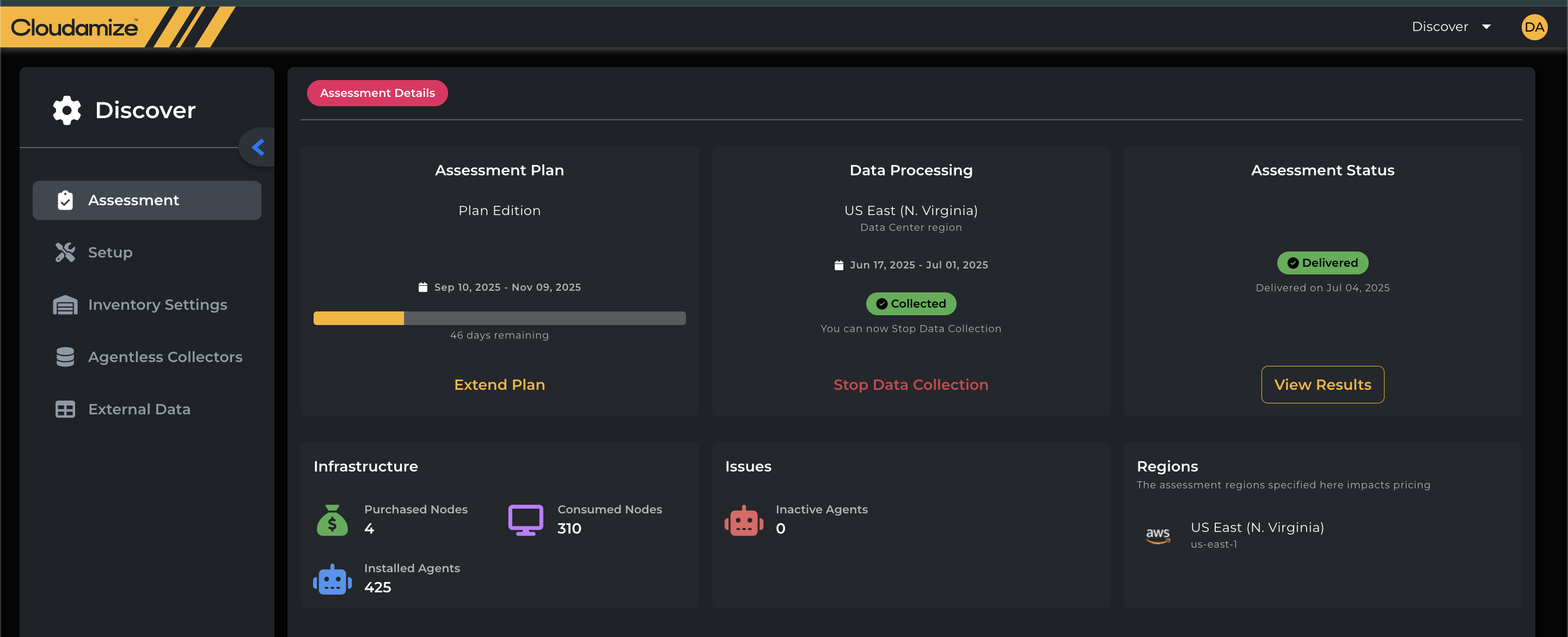 The Assessment tab in the Discover page displays key details relevant to your assessment's current status. To access the Assessment details, please select the “Discover option” from the Cloudamize Landing page as shown below.