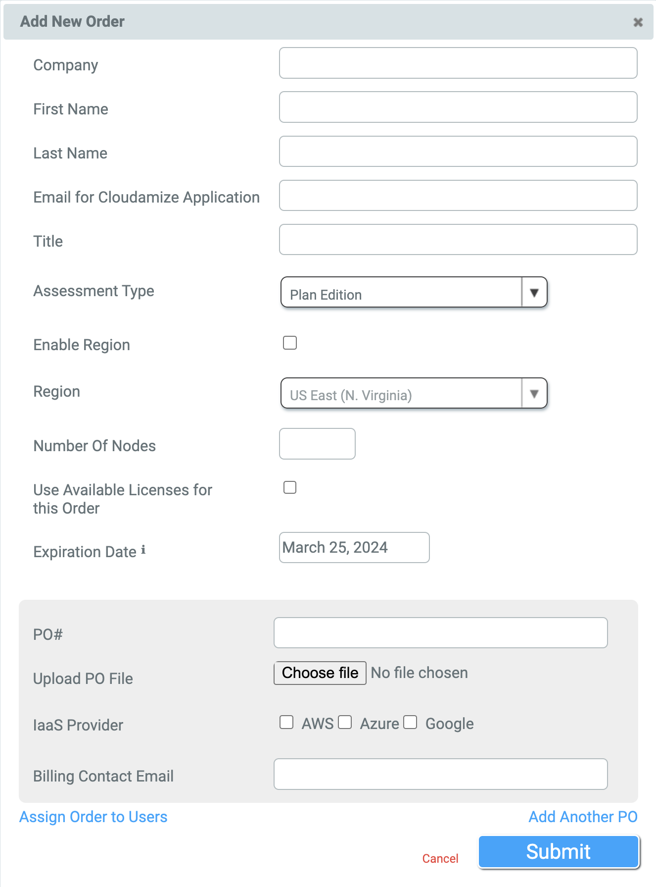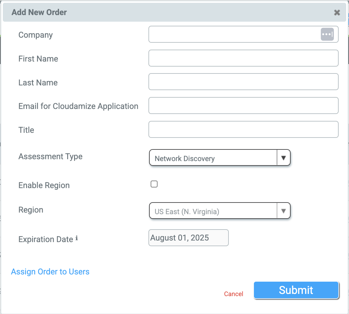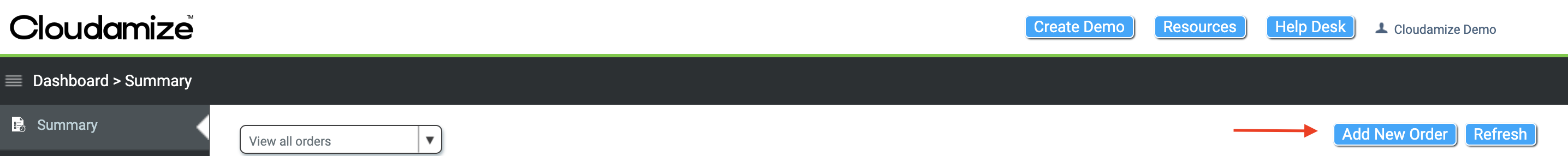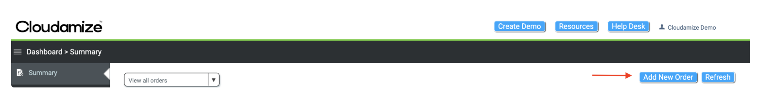 Note: If a user doesn't see the Add New Order button, the logged-in user lacks admin permissions. In such cases, they should contact their dashboard admin or contact Cloudamize support for assistance in creating the order.
