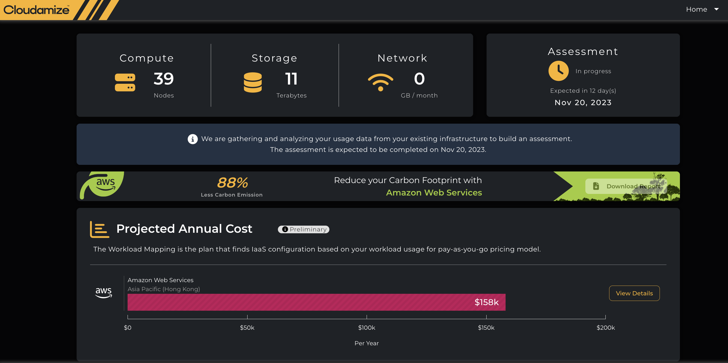 Once the Cloudamize assessment has started, the Preliminary Hardware plan will be available within a few days (depending on the number of machines being monitored). This plan will give results for a 1-to-1 hardware mapping of your infrastructure and the associated costs in the cloud. These results are calculated based on the type of CPU, number of CPU cores, allocated memory, number of storage disks, and storage disk sizes. At this stage, the performance data (actual CPU utilization, memory consumption, network) have not been considered. Cloudamize will try to find a similar recommendation to what you are running in your current environment.