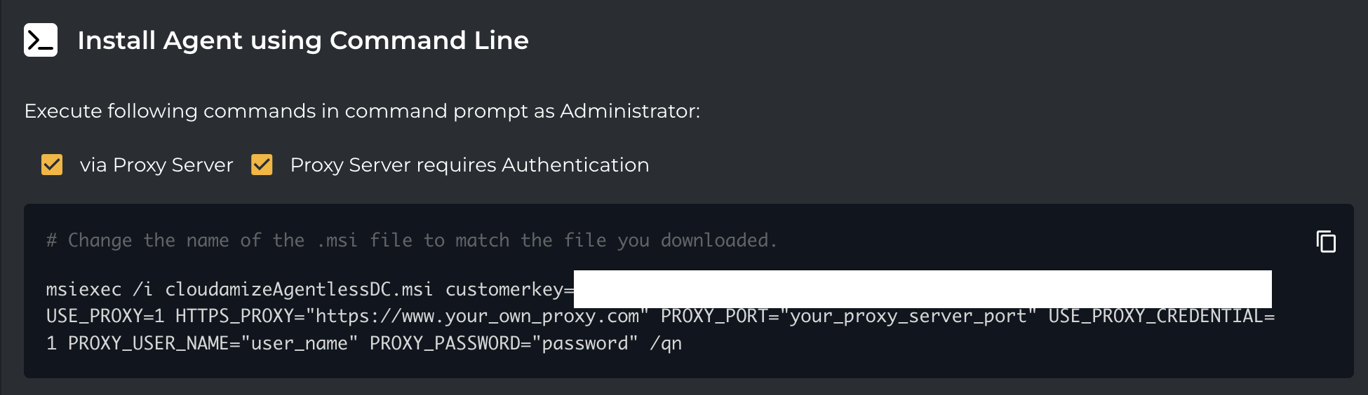 msiexec /i <downloaded MSI file> CUSTOMERKEY="your key" USE_PROXY=1 HTTPS_PROXY="https://www.your_own_proxy.com" PROXY_PORT="your_proxy_server_port" USE_PROXY_CREDENTIAL=1 PROXY_USER_NAME="user_name" PROXY_PASSWORD="password"