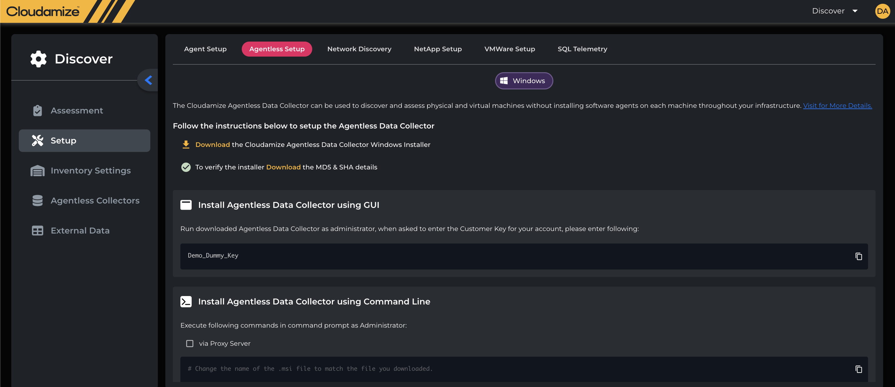 Enter the customer key that was generated for the assessment. The customer key is available under the Install agent using the GUI. It is located by going to the Console portal here and navigating to Discover > Setup > Agentless Setup