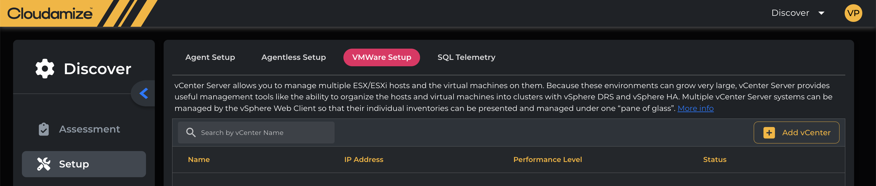 The VMWare Setup page contains all the tools you need to connect your vCenter to the Cloudamize data collection endpoint to analyze any servers it manages.
