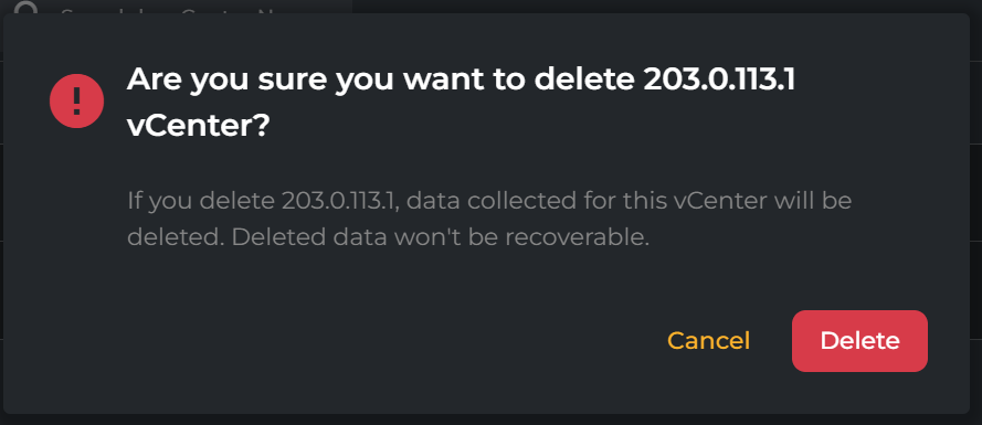 Deleting a vCenter will prompt for confirmation, as data is non-recoverable once deleted: