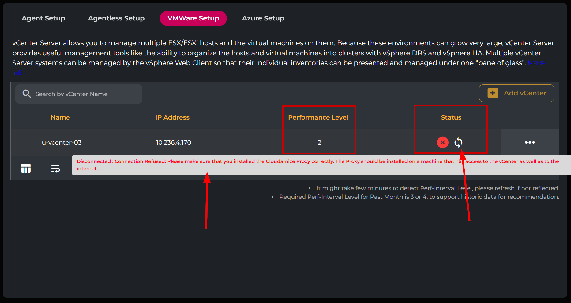 The current status of the connection to the vCenter is also displayed, along with any error messages. Debugging information can be found in the vCenter section of our KB.