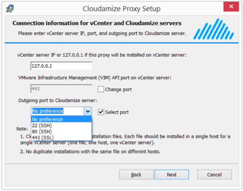 You will need to allow outbound traffic on port 443 to IP address 52.202.114.20. You will also need to allow traffic on port 443 from the VM or vCenter with the Cloudamize Proxy installed to the vCenter IP address. Alternatively, the Cloudamize vCenter Proxy supports traffic over port 22 and port 80. If you choose to use either of these ports, please be sure to check that your firewall configuration is set correctly.